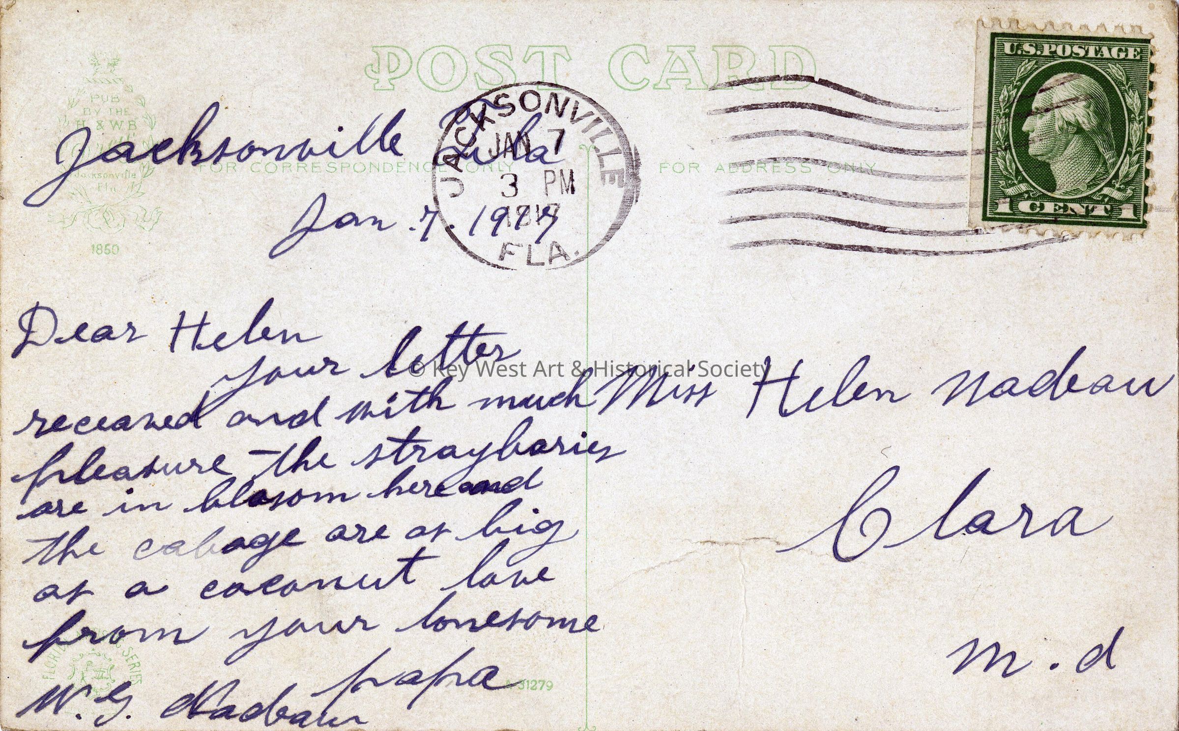 Postcard depicting Long Key Fishing Camp, part of Henry Flagler's Overseas Railway. The message on the verso reads, 'Jan 7, 1917, Dear Helen, Your letter received and with much pleasure the straybaries [sic] are in blosom here and the cabage are as big as a coconut . Love from your lonesome papa. W. G. Nadeau' The card is addressed to Miss Helen Nadeau, Clara, Maryland and is postmarked Jacksonville, January 7, 1917.Subject Place