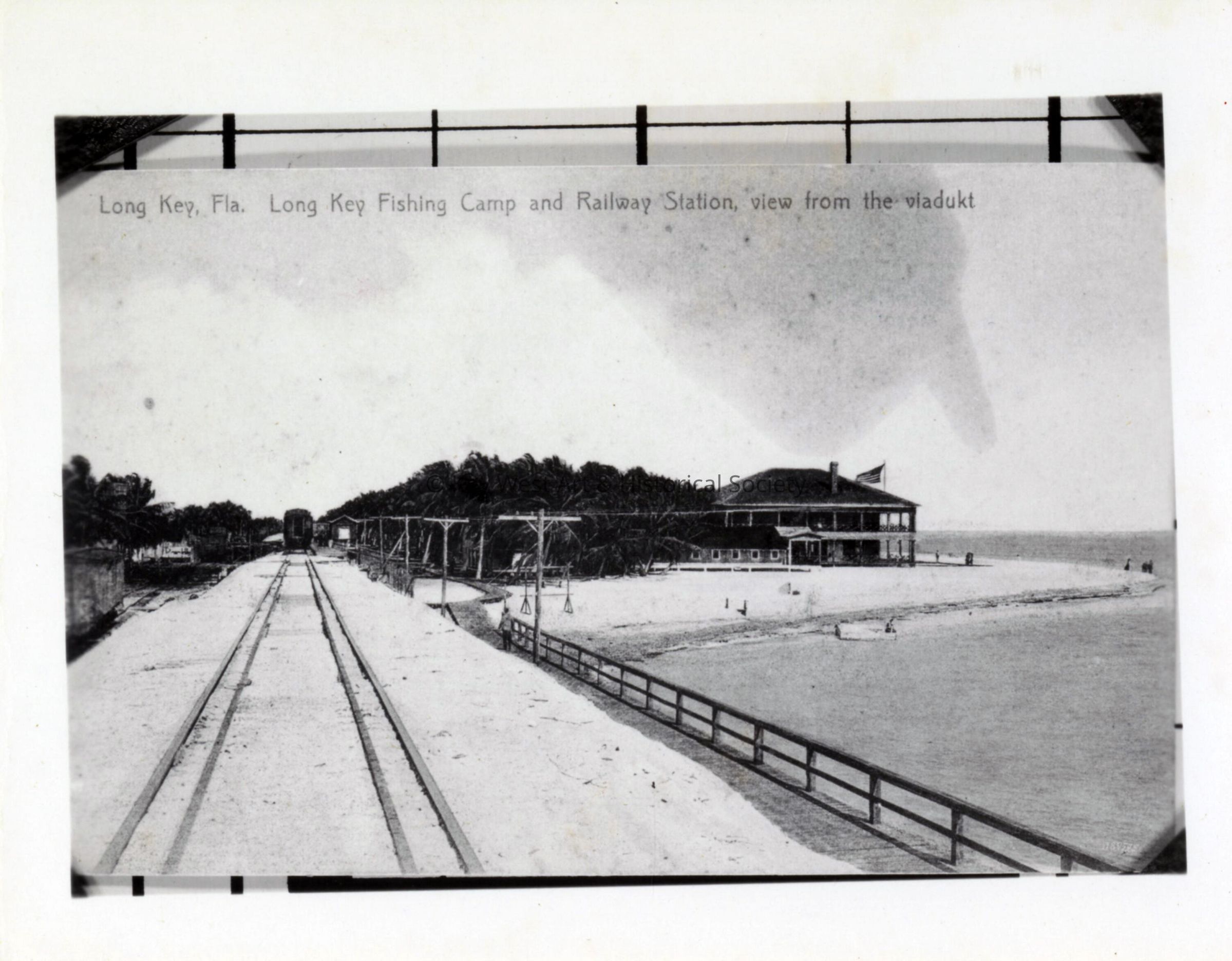 Black and white photograph of Florida East Coast Railway's Long Key Fishing Camp and the Long Key train station.