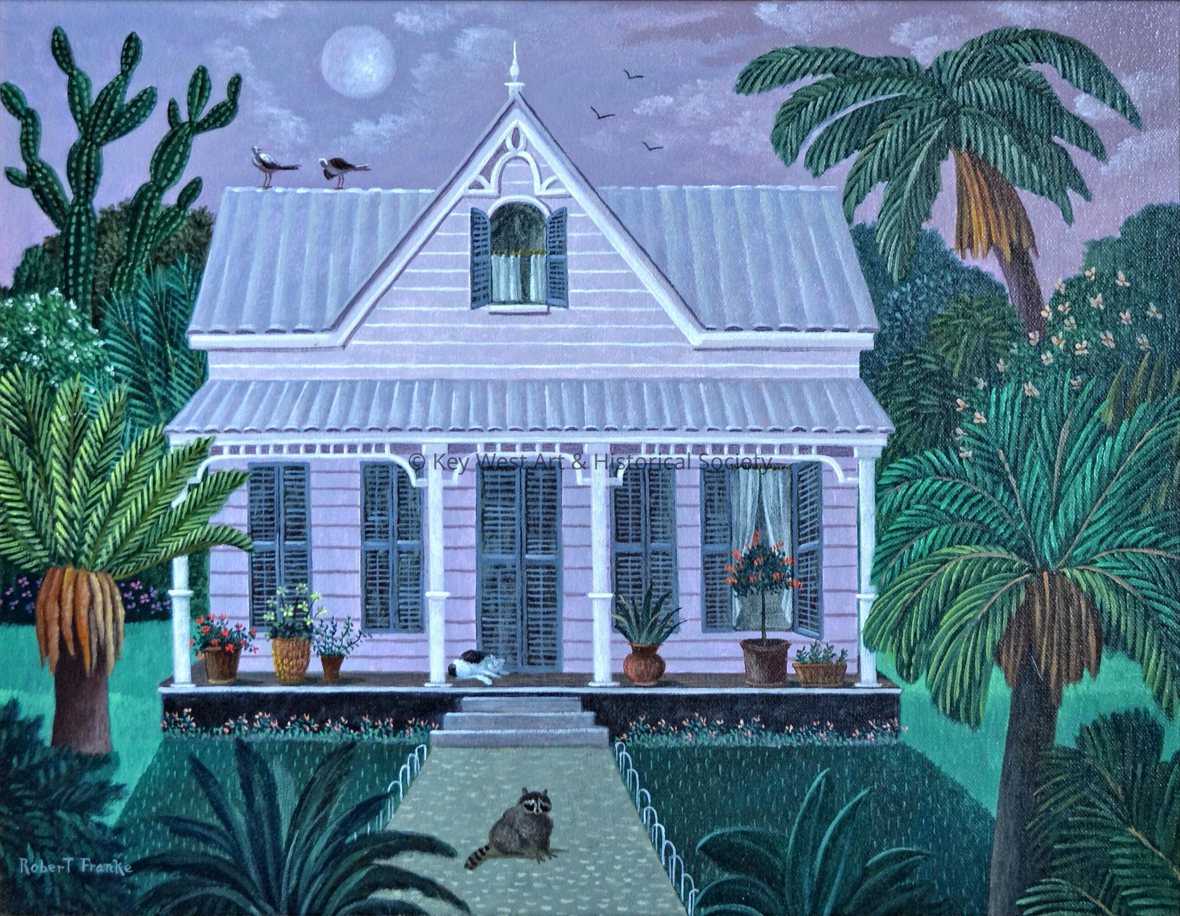 Oil painting on canvas by Robert Franke depicting a Key West house at night. A raccoon is located on the front path while a cat sleeps on the front porch.Artwork Details