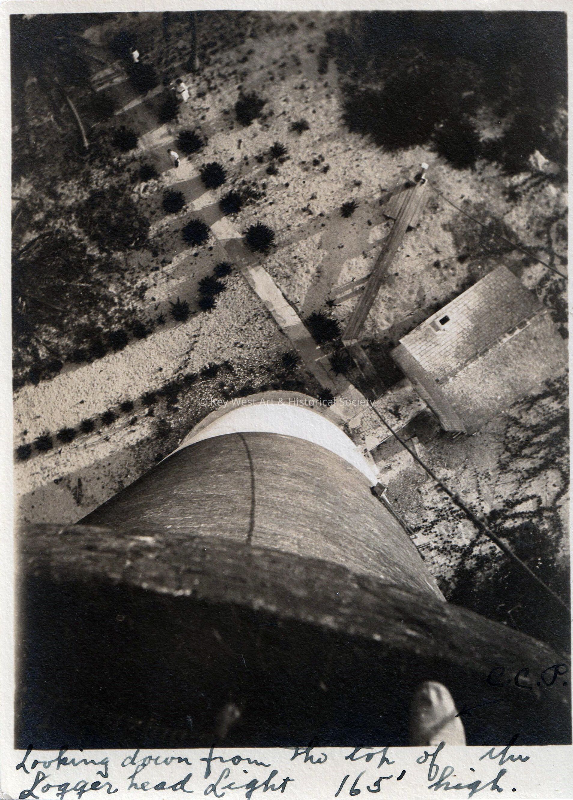 Black and white photograph taken from the top of Loggerhead Lighthouse on Loggerhead Key in the Dry Tortugas. The tower is 165 feet tall and there is a view of the adjacent keeper's quarters on the right.