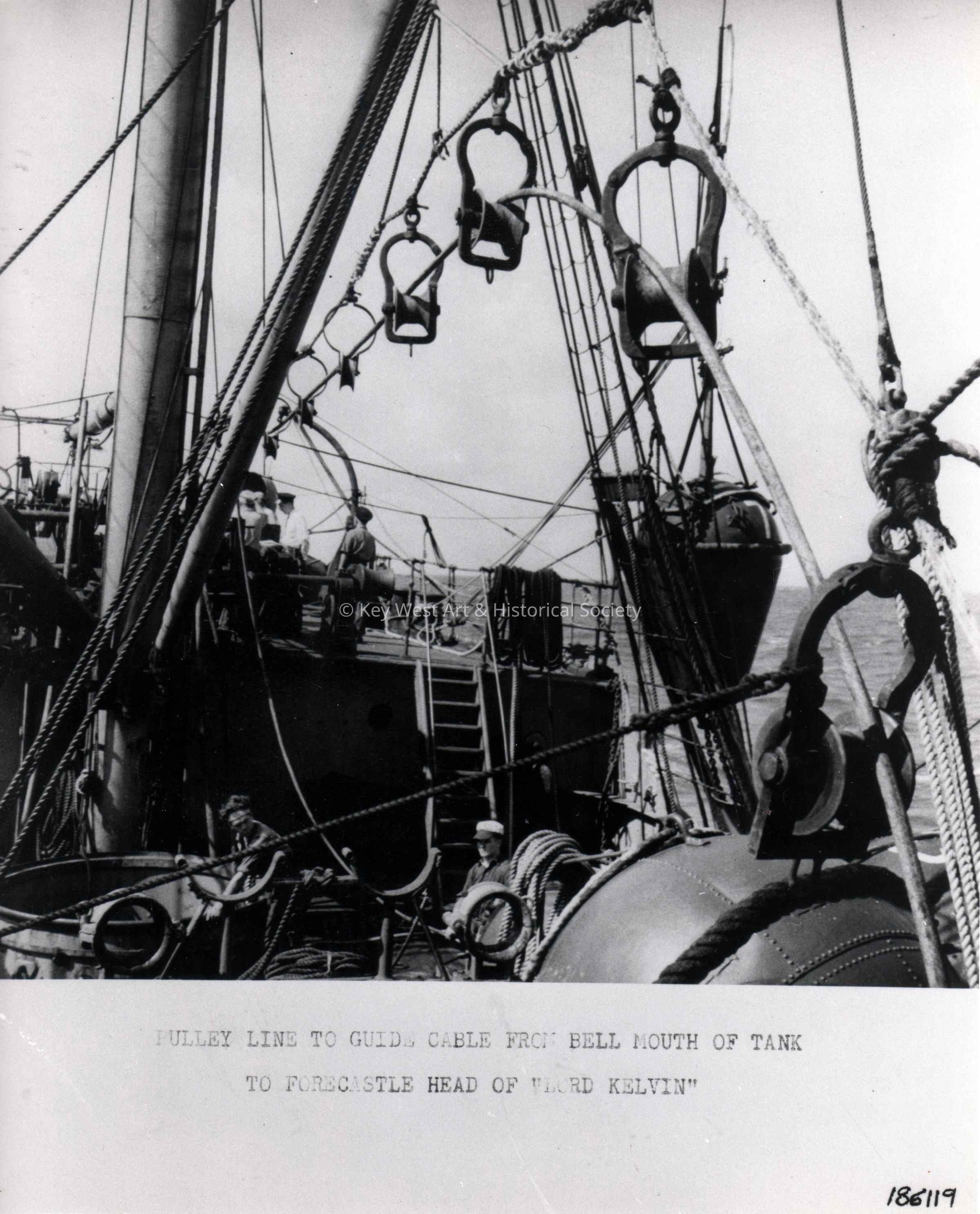 Pulley line to guide cable from bell mouth of tank to forecastle head of Key West-Havana Cableship Lord Kelvin.Collection