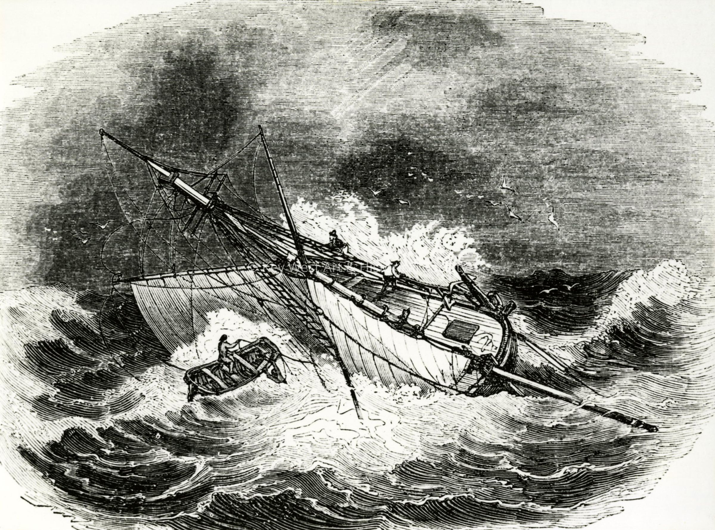 Black and white photograph taken from an illustration entitled 'Loss of the Betsy' from Chronicles of the Sea, December 15, 1838. Illustration used to depict the wrecking industry.