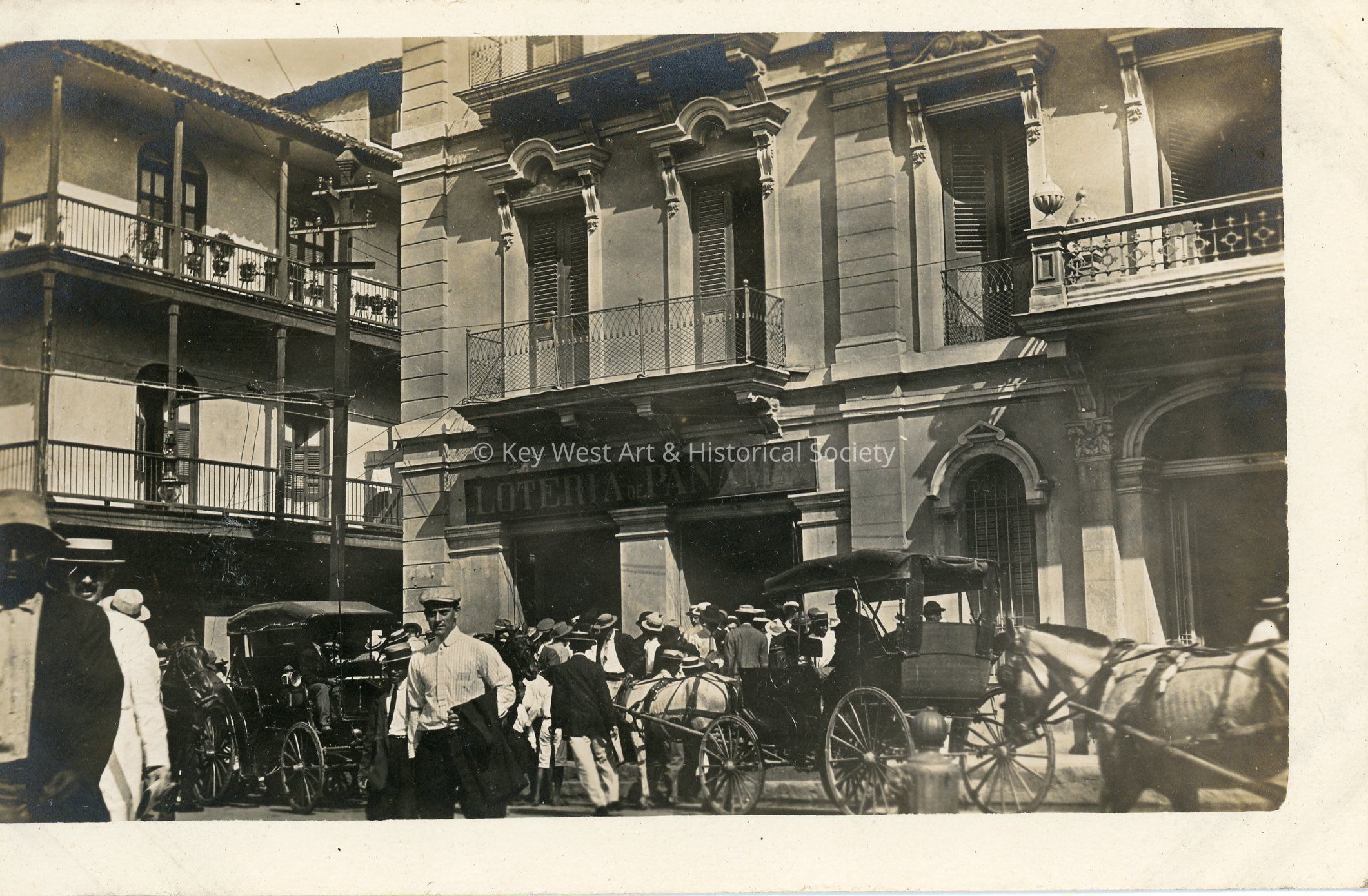 Black and white photograph postcard depicting the streets of Panama City. The image shows the Loteria de Panama building with a large crowd outside. Horse drawn carriages are on the street. The postcard is dated January 1913 and is addressed to Mrs. G.A. Balling. Verso has a handwritten note.Subject