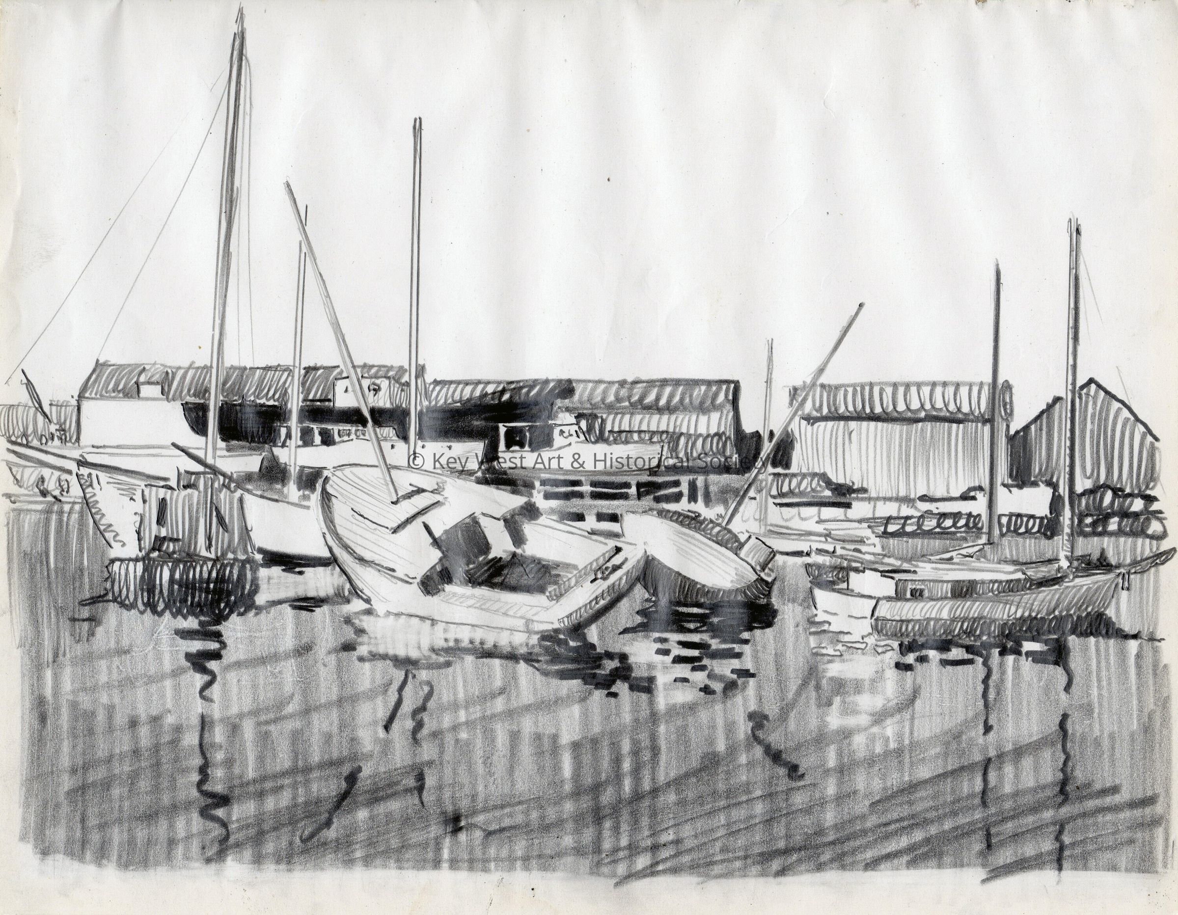 Pencil drawing on paper of sailboats in a harbor with warehouses in the background. Matted and framed.Type of Drawing