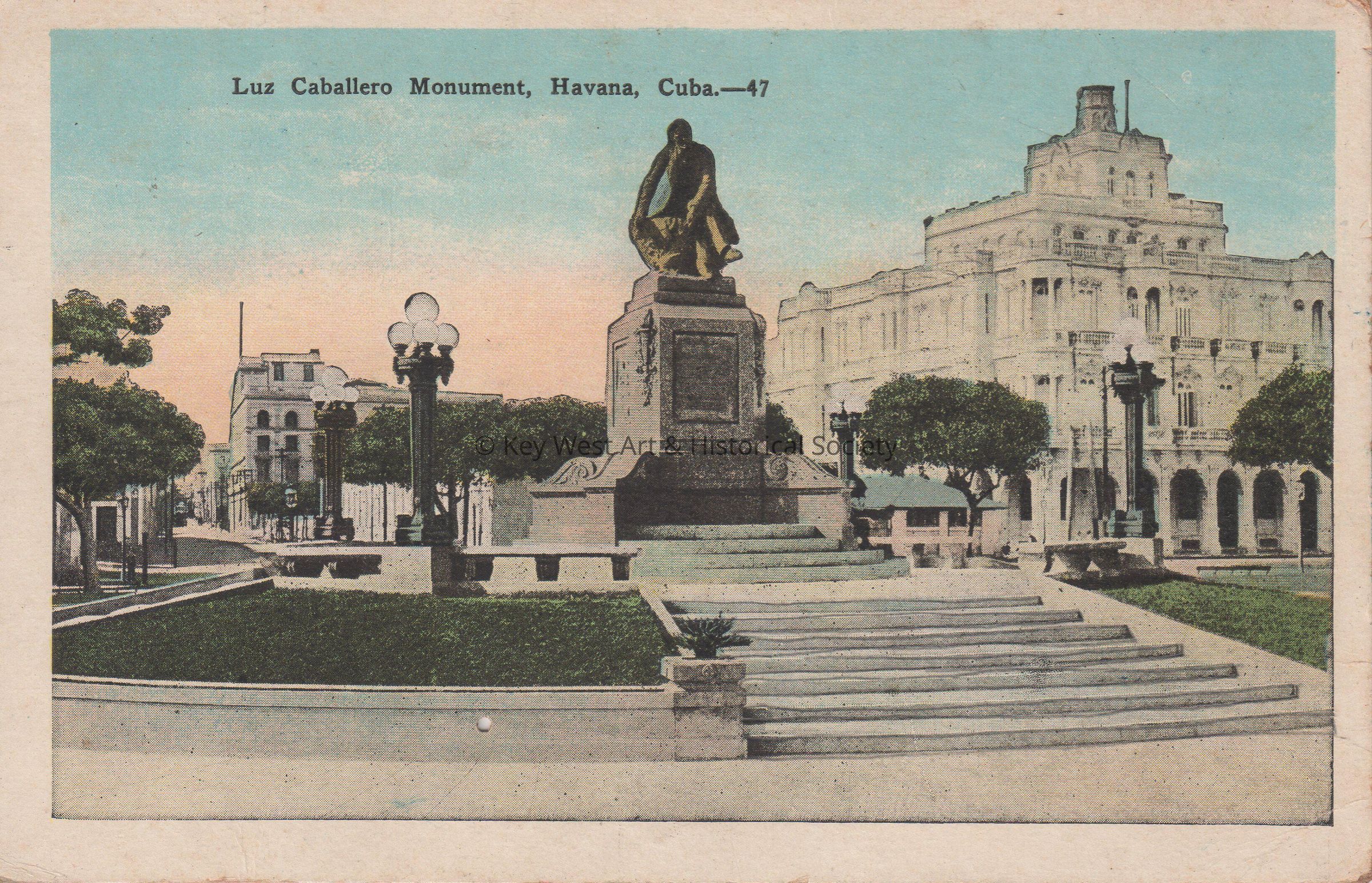 Postcard depicting a statue of a seated man in front of large buildings. The caption reads, ‘Luz Caballero Monument, Havana, Cuba.’ The description on the verso reads, ‘Luz Caballero Monument in honor of a Cuban patriot and educator.‘Subject Place