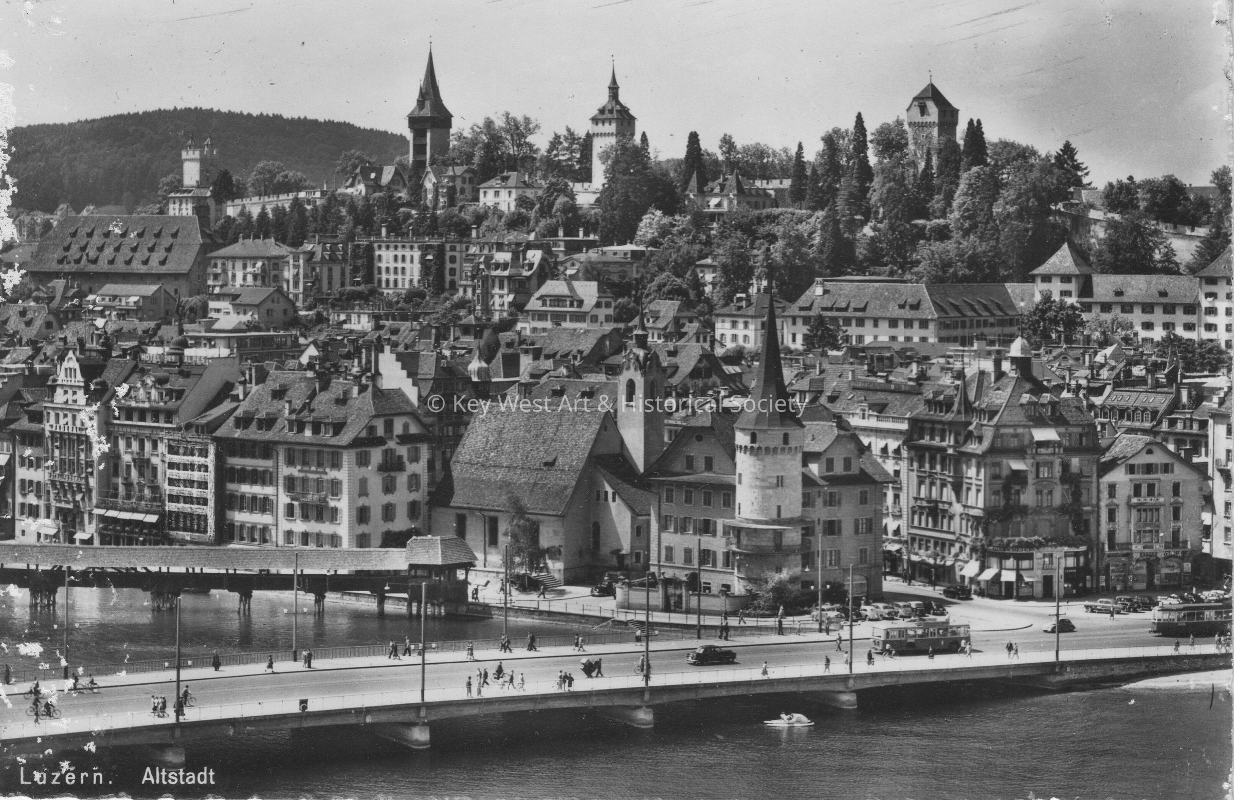 Postcard of a Bavarian-looking town on a river. The caption reads, ‘Luzern, Altstadt’.Collection