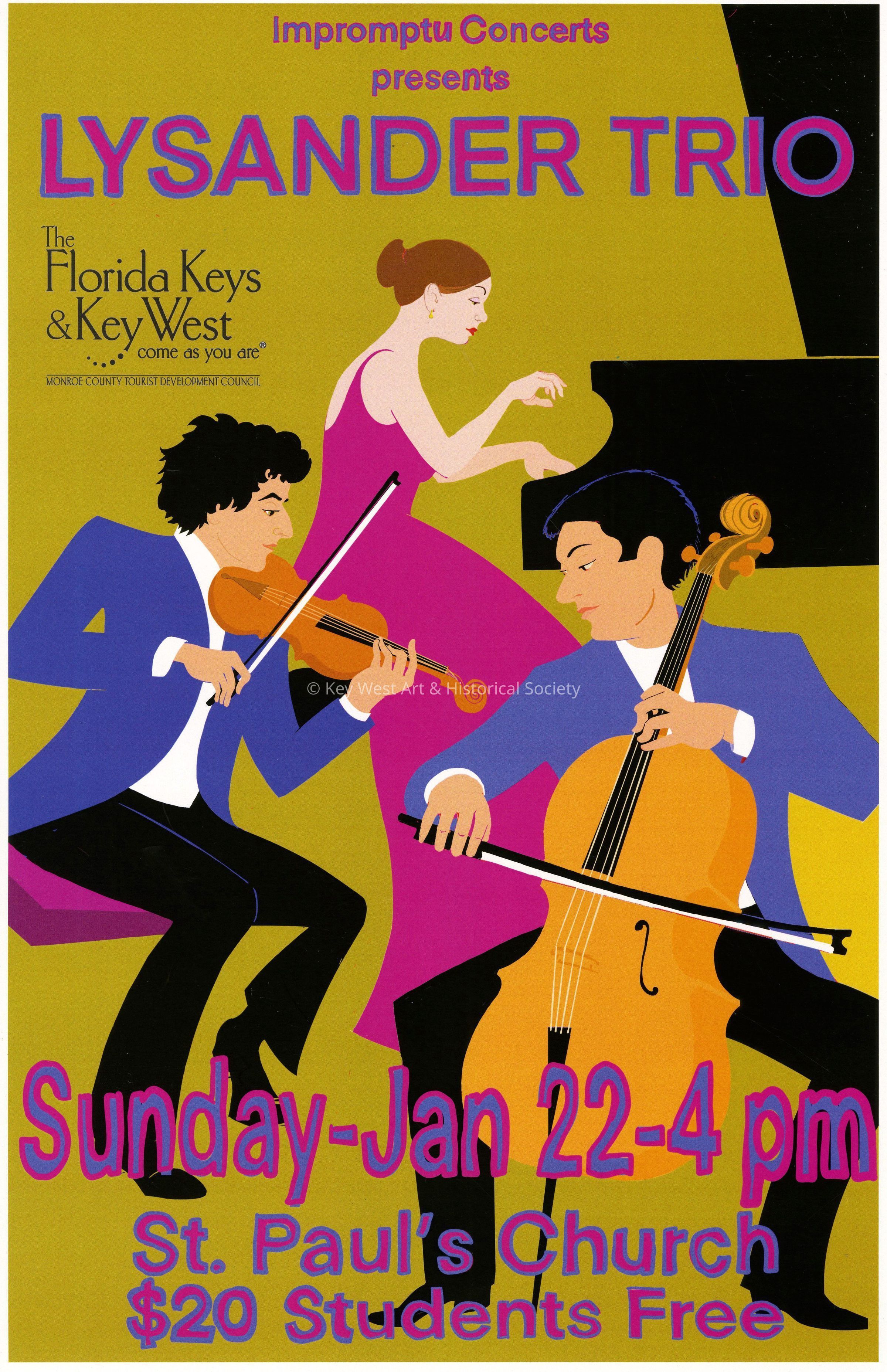 An advertising poster for Impromptu Classical Concerts entitled 'Lysander Trio'. The concert took place on January 22, 2023 at St. Paul's Episcopal Church at 401 Duval Street.Collection