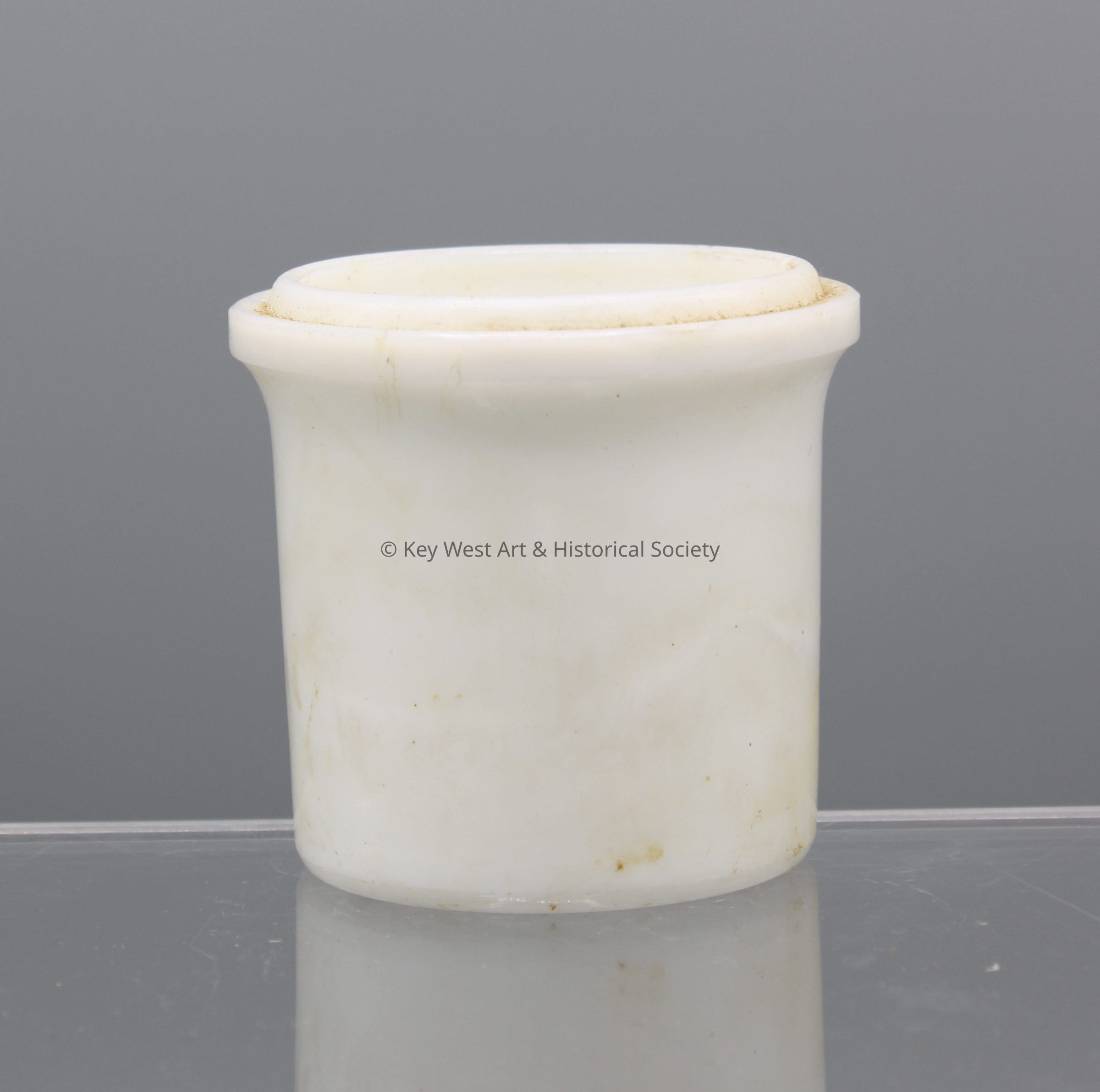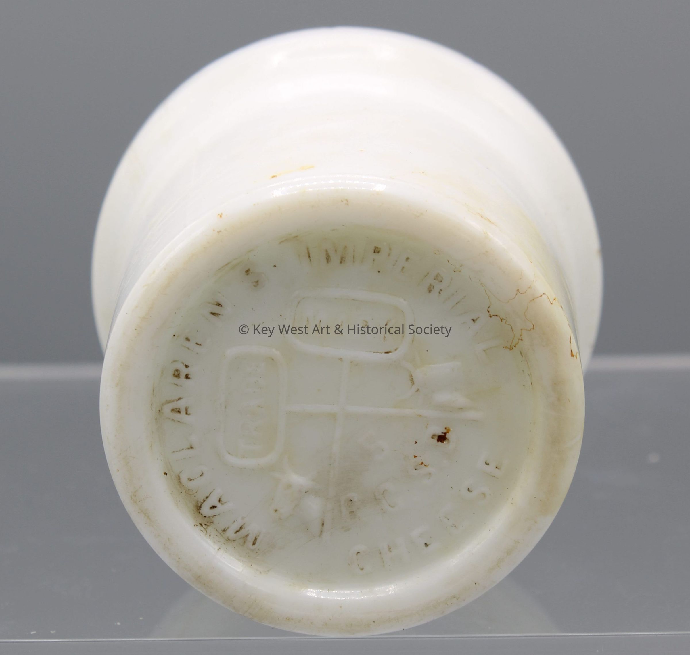 Milk glass bottle/jar with embossing on the base that reads 'MacLaren's Imperial / Cheese.' Between the two lines of text is a makers mark which includes two cow heads.Use