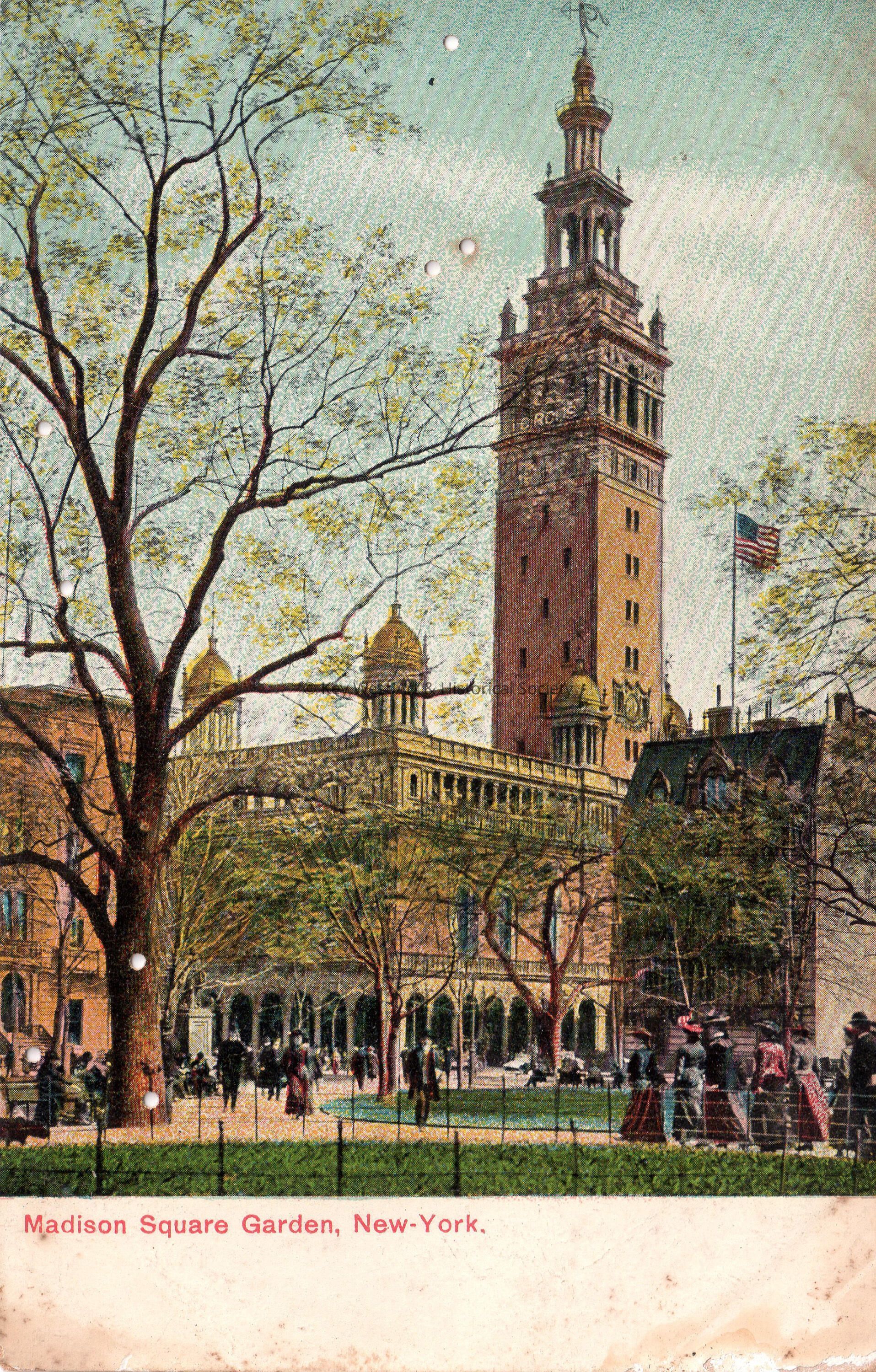 Postcard depicting people in a park amidst tall buildings. The caption reads, ‘Madison Square Garden, New York.’Collection