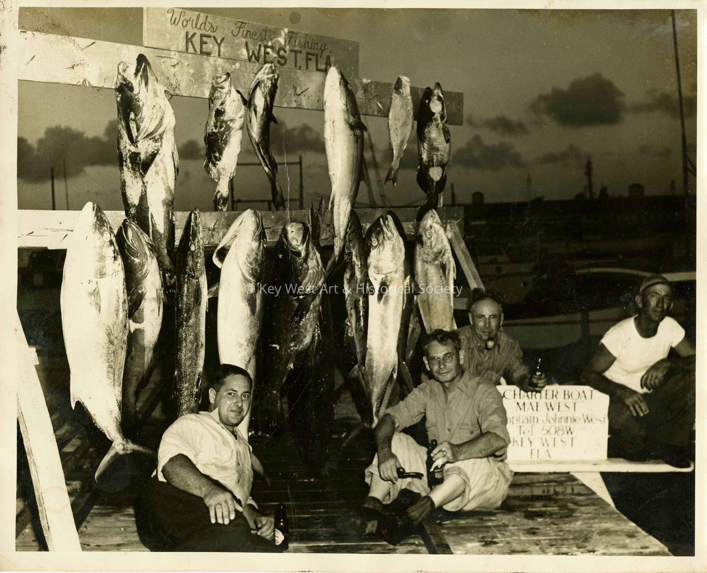 Black and white photograph four unknown men on the dock of Garrison Bight alongside the fishing charter boat MAE WEST. Their catch hangs from dockside fish display. One of the men is likely Captain Johnnie West.