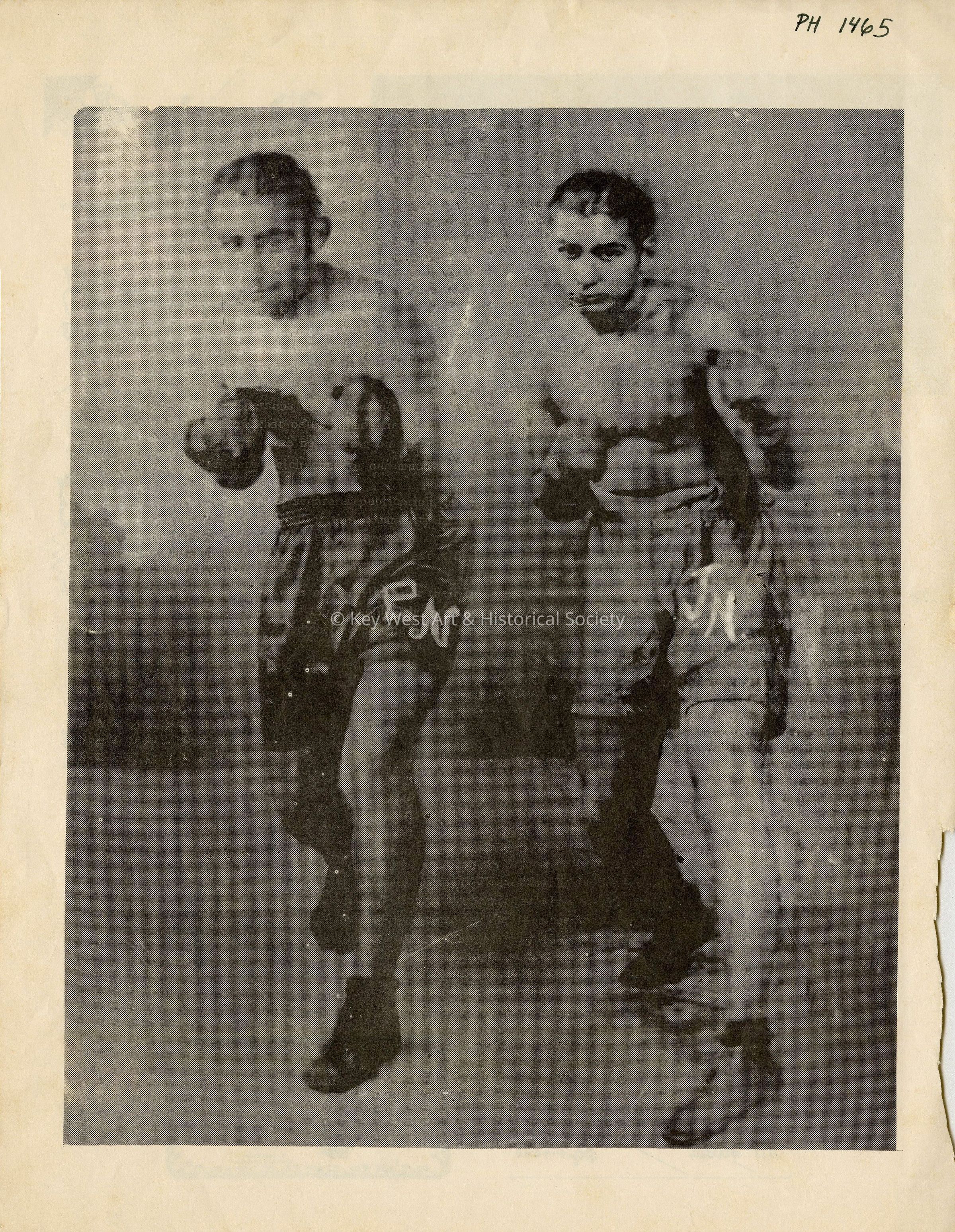 A detached magazine page from a Key West publication depicting two boxers with the initials P.N. and J.N., possibly brothers. On the verso are advertisements for the Square Deal Market, the La Brisa, and the Old Coffee Mill.