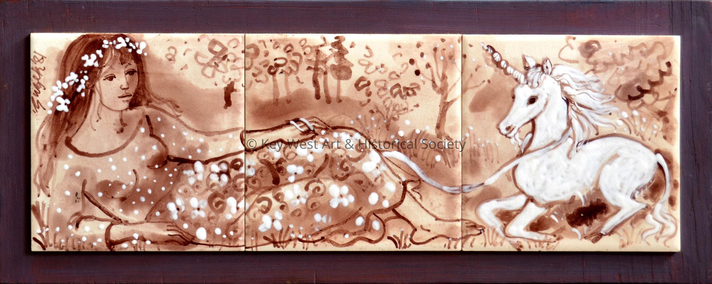 Tile on plywood artwork by Suzie Zuzek dePoo displaying a captivating triptych on ceramic tiles, featuring sepia-toned artworks adhered to a wooden plank. On the left panel, a woman with flowing hair embellished with a floral wreath reclines gracefully, her gaze serene yet expressive. The central panel subtly transitions to her body in a reclining position, alluding to a dreamlike state or a mystical environment. This flows into the right panel where a spirited unicorn, depicted with dynamic strokes and surrounded by floral motifs. The overall composition blends elements of mythology and nature with an ethereal, timeless quality, suggesting themes of fantasy and the inherent beauty of the wild and mythical. Each tiles measures 6" x 6".Artwork Details