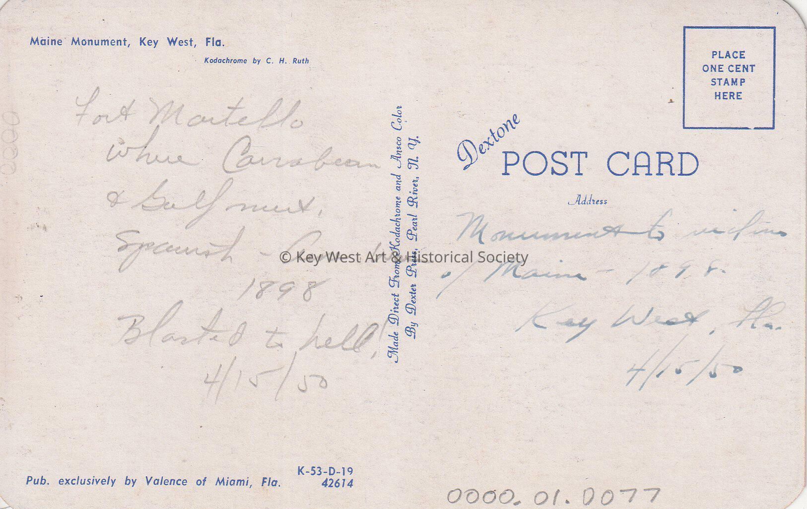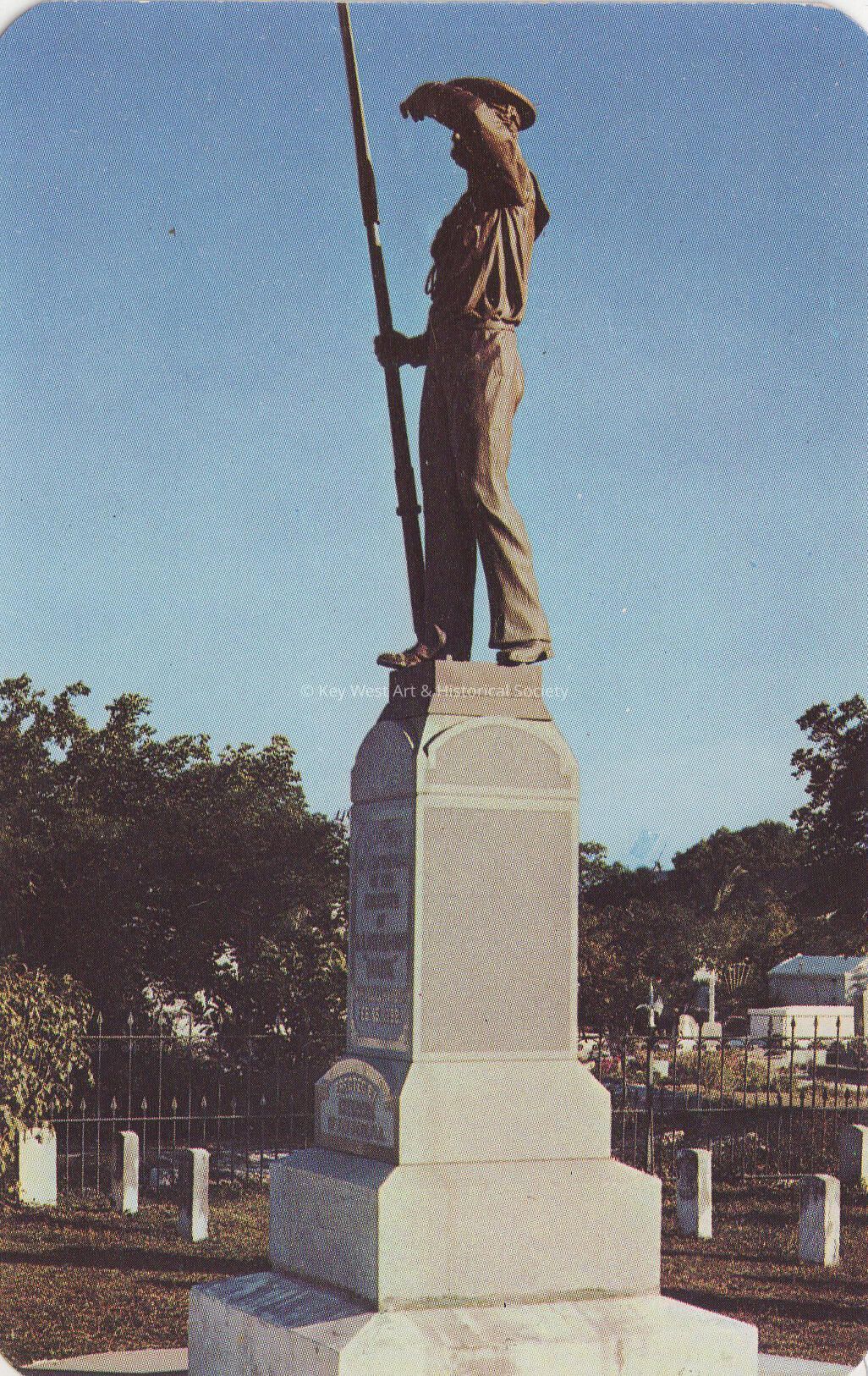 Postcard depicting a monument of a sailor. The description on the verso reads, 'Maine Monument, Key West, Florida.' The message on the verso reads, 'Fort Martello where Caribbean and Gulf meet. Spanish American War of 1898, blasted to hell. Monument to victims of the U.S.S. MAINE, 1898. Key West, Florida'.Subject Place