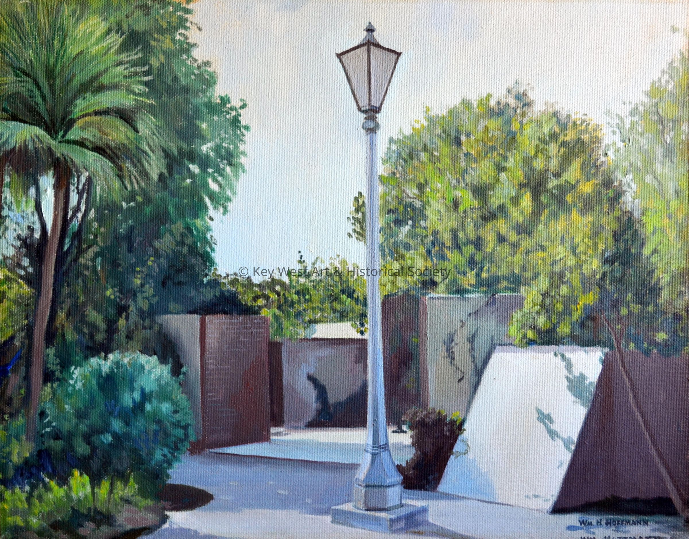 Oil painting on masonite by William Hoffman depicting a lamppost and landscaping around present-day Mallory Square.Type of Painting