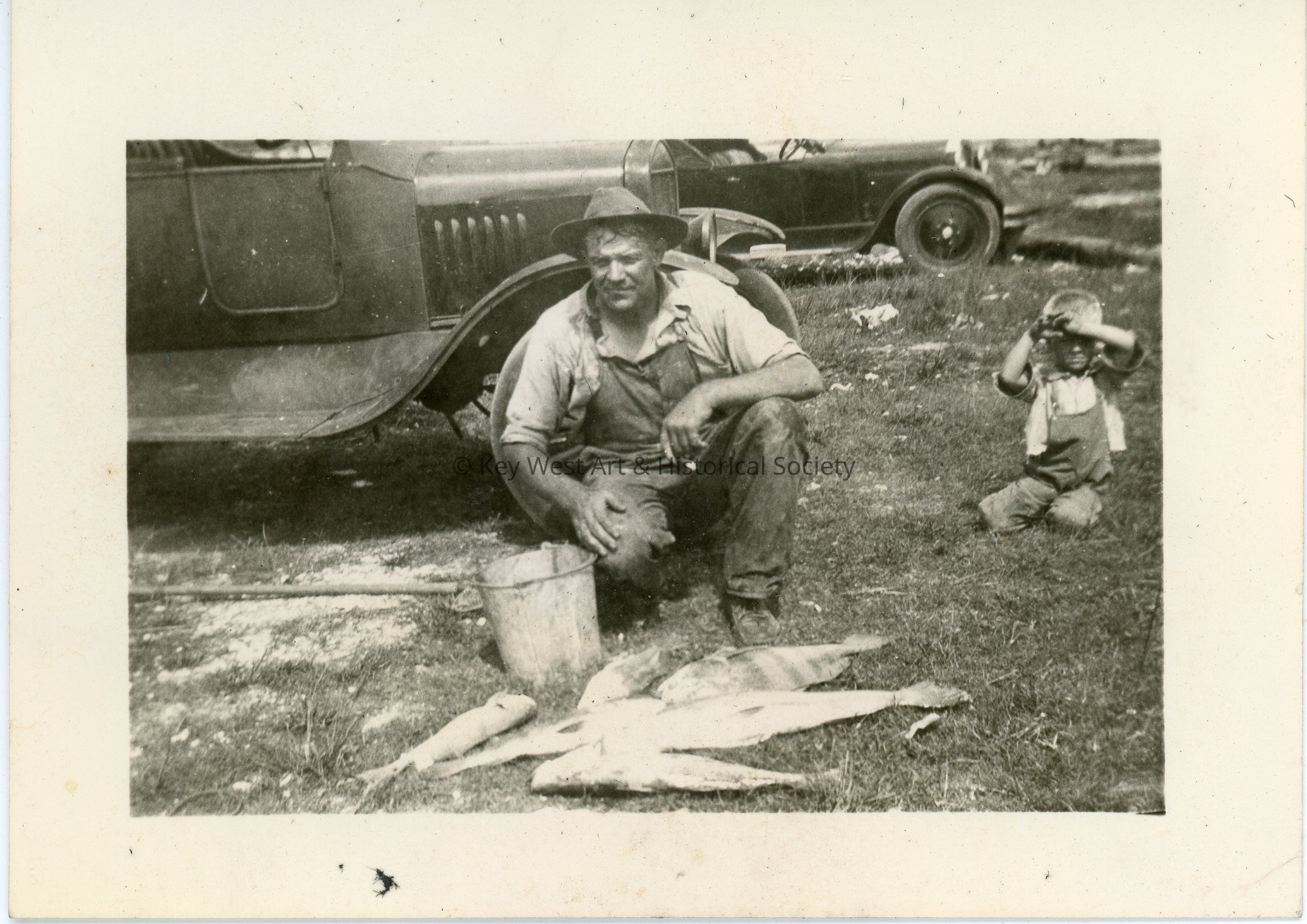 Black and white photograph of a man kneeling behind a pile of fish on the ground. Behind the man are cars. To the man's left is a small boy. The photo was part of a photograph album began by Victor H. Baker in 1940.