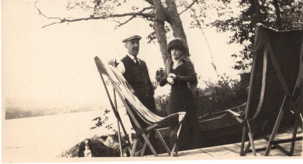 Black and white photograph of an unknown man and woman on a lakeshore.Collection