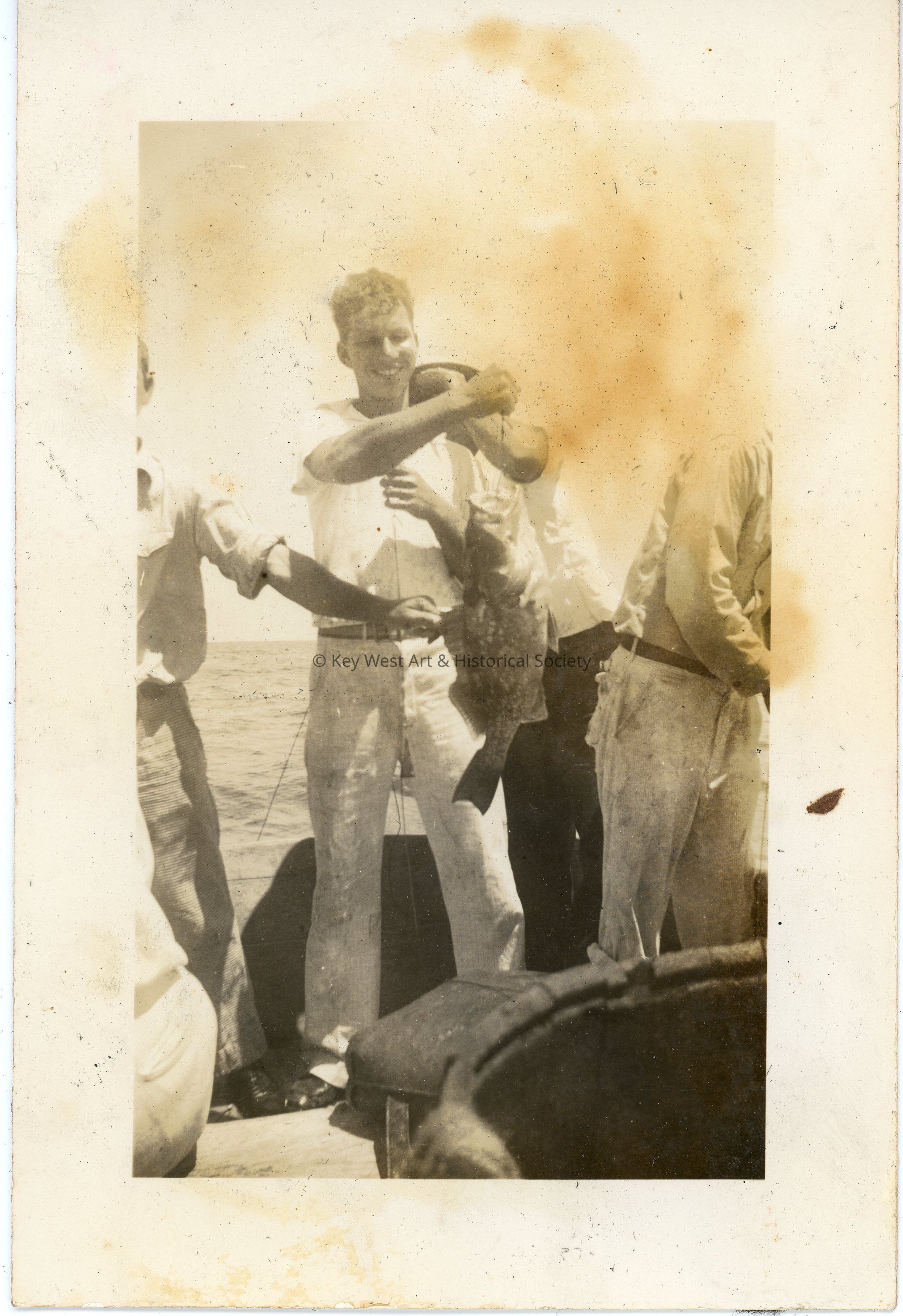 Black and white photograph of a man on a boat holding a fish attached to a line. There are other men surrounding him. The photo was part of a photograph album began by Victor H. Baker in 1940.