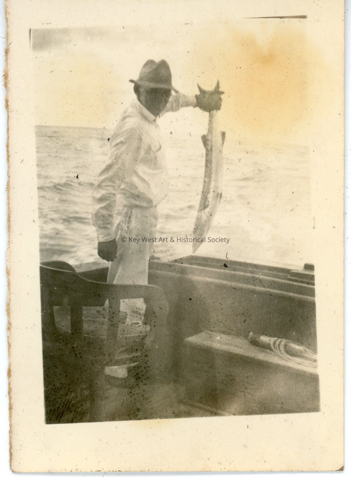 Black and white photograph of a man wearing a trilby hat holding a long fish. The photo was part of a photograph album began by Victor H. Baker in 1940.