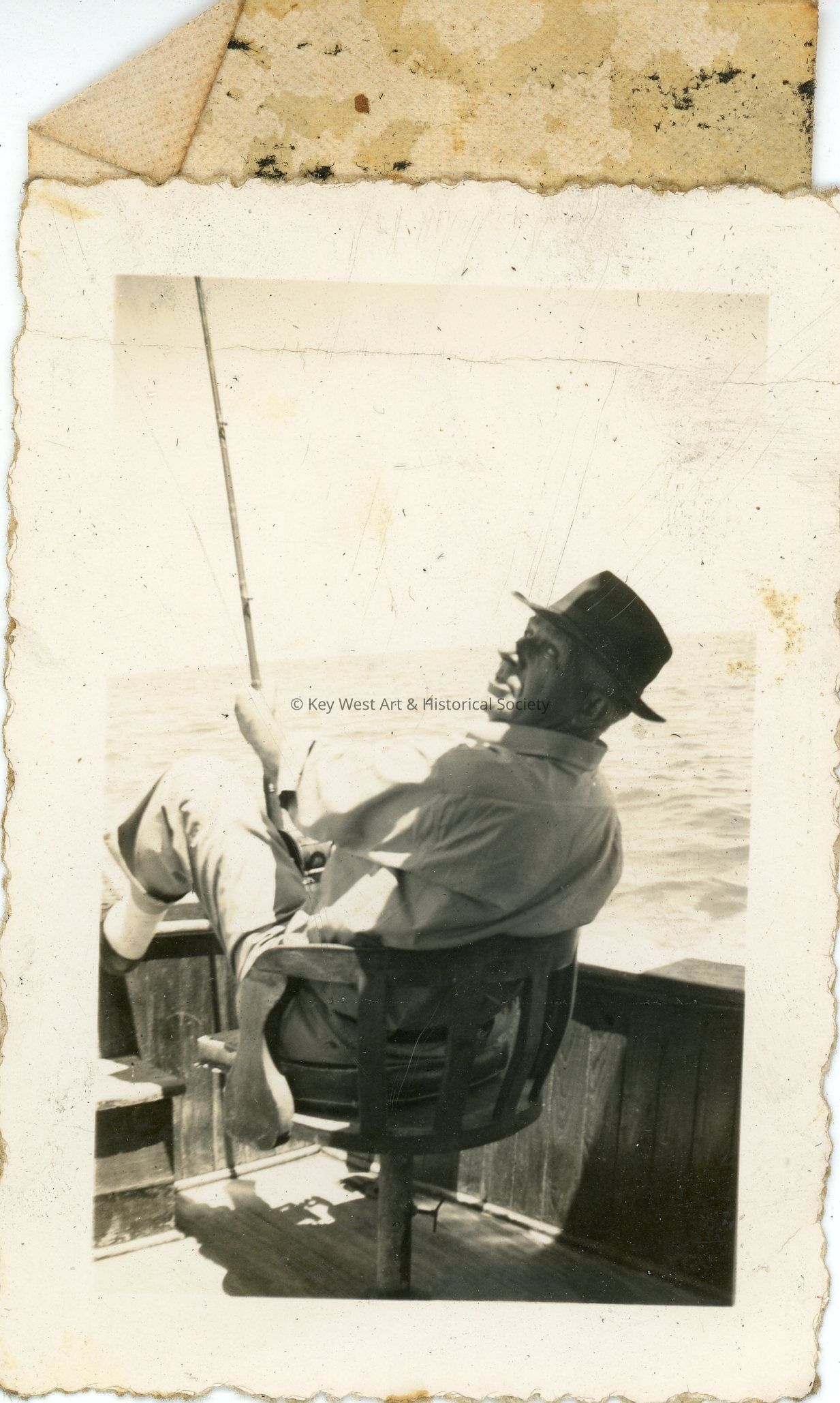 Black and white photograph of a man in a fedora fishing. The photo was part of a photograph album began by Victor H. Baker in 1940.