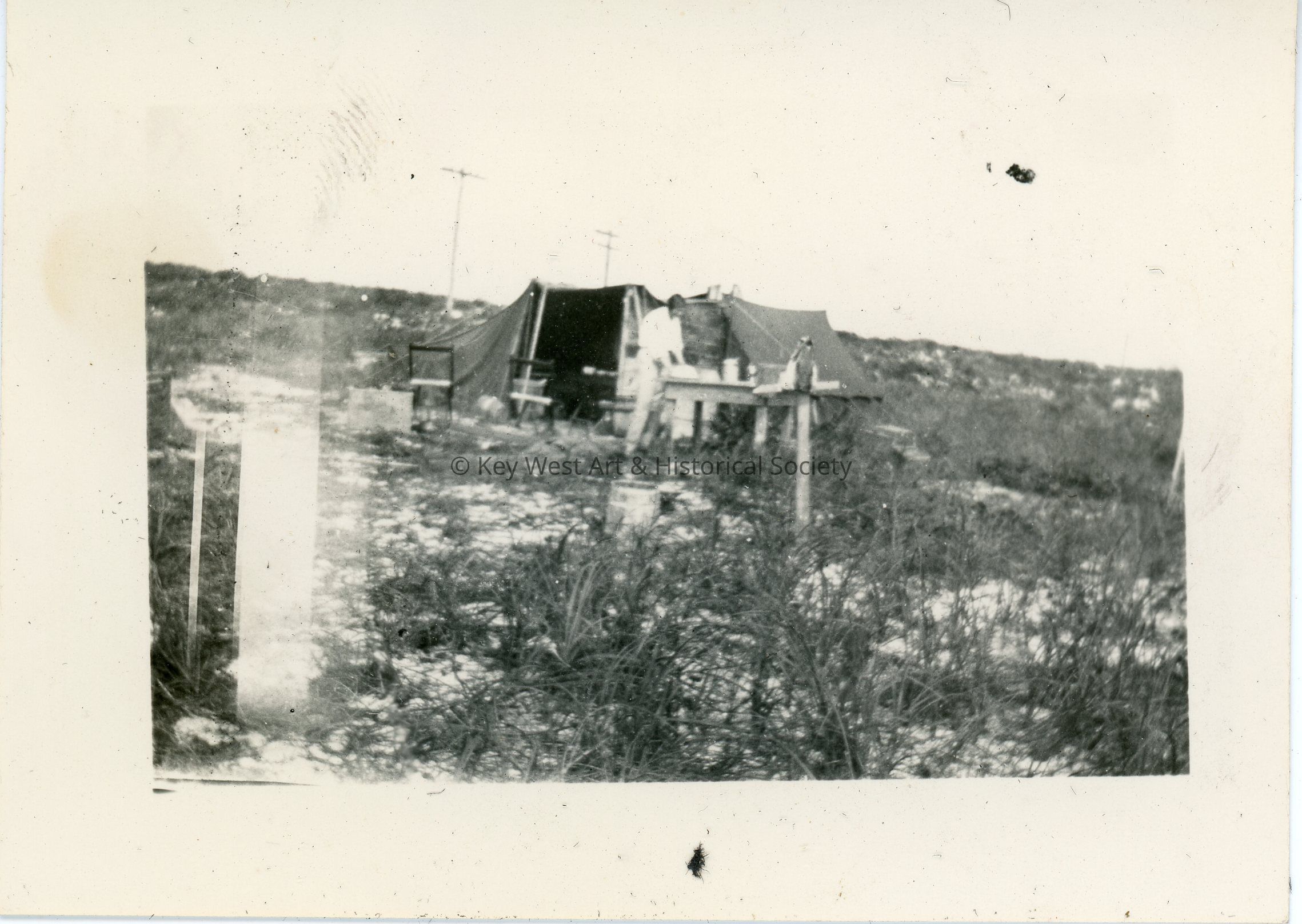 Black and white photograph of a man standing at a table in front of a tent. The photo was part of a photograph album began by Victor H. Baker in 1940.