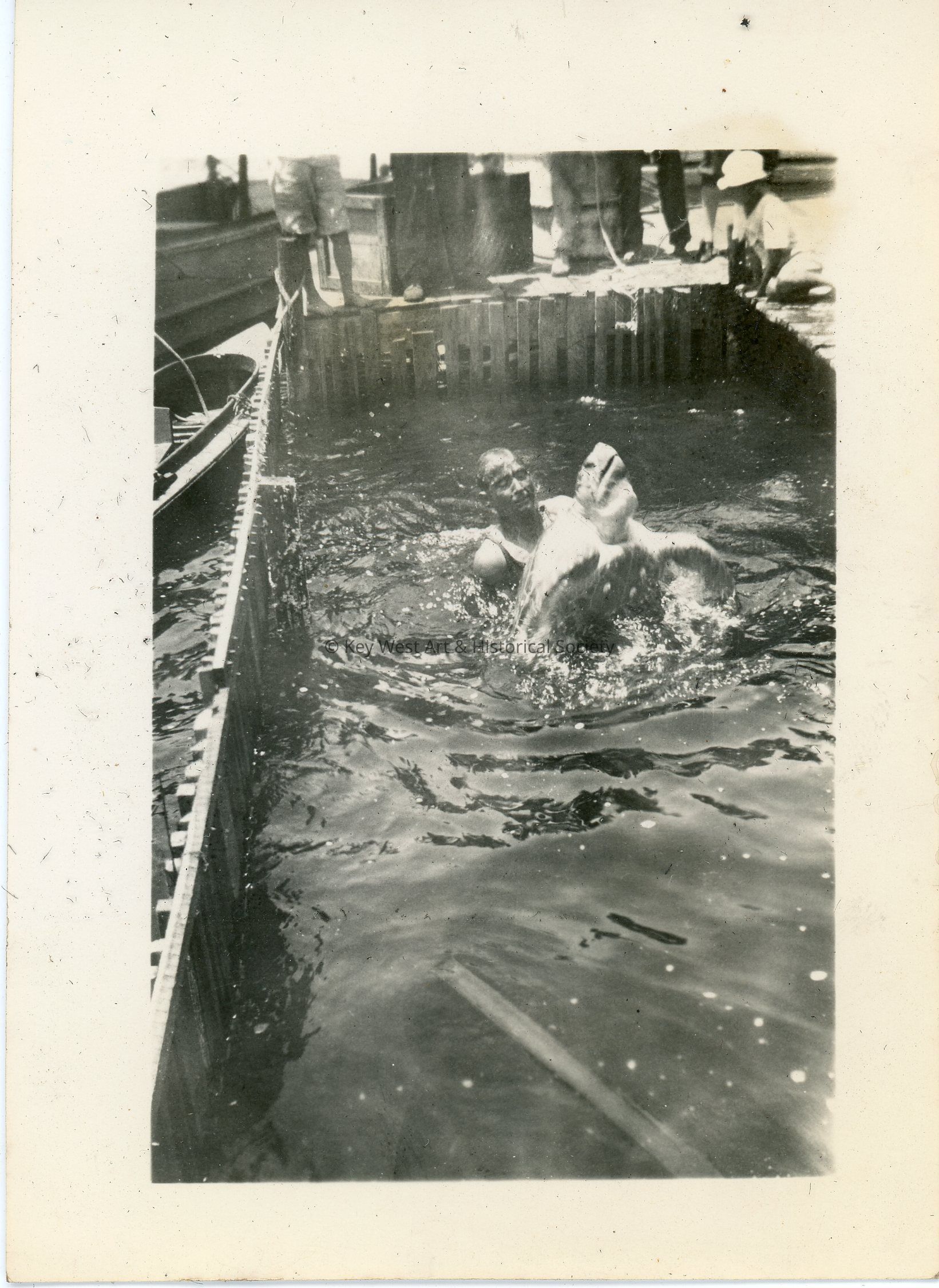 Black and white photograph of a man catching a turtle in the turtle kraal in Key West Bight. The photo was part of a photograph album began by Victor H. Baker in 1940.