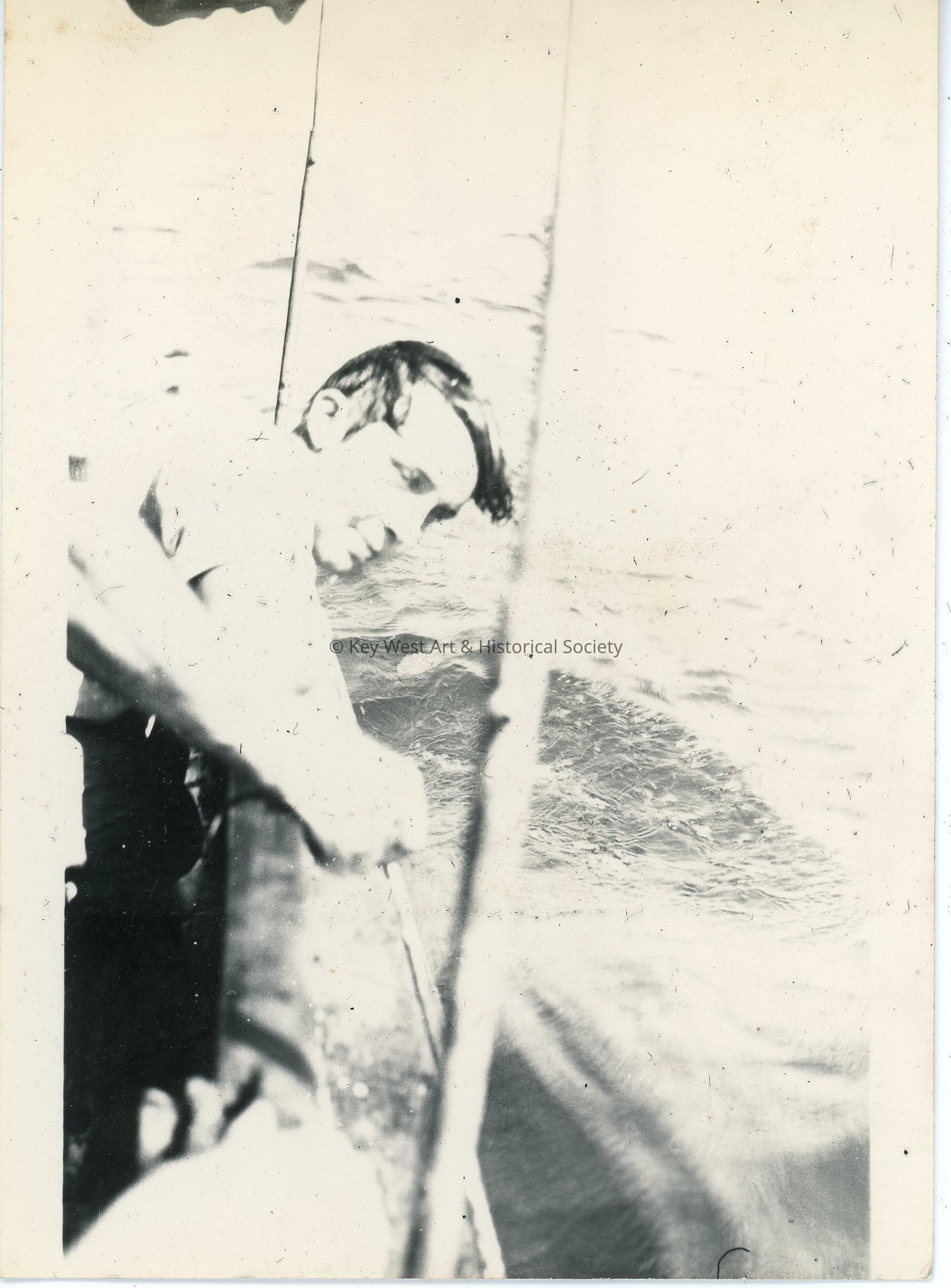 Black and white photograph of a man leaning against the side of a water vessel. The photo was part of a photograph album began by Victor H. Baker in 1940.