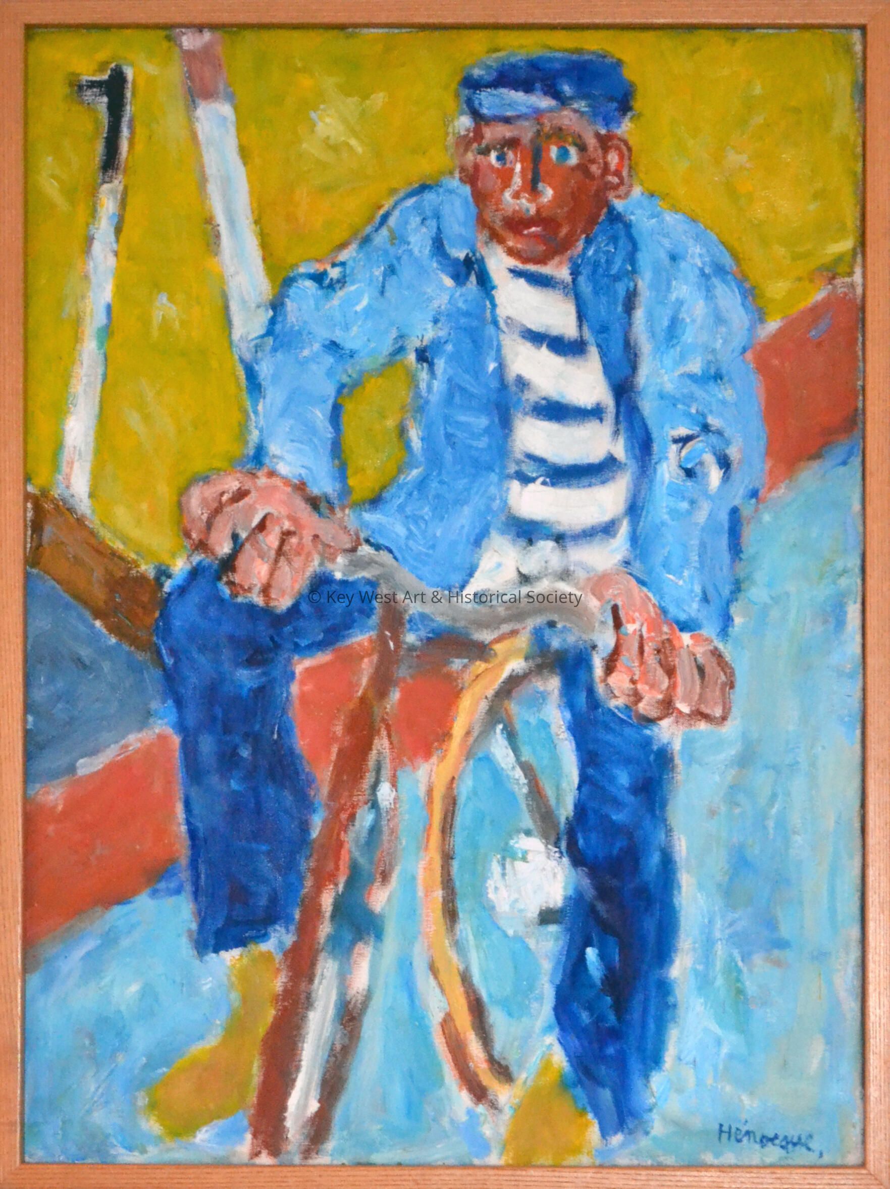 Oil painting on canvas by Andre Henocque depicting a man gripping the handlebars of a bicycle in an expressionist style. The male figure is rendered in bold strokes of blue and white, wearing a striking blue jacket and a horizontally striped shirt which gives him a slightly nautical appearance. His facial expression, accentuated by pronounced blue and pink tones, conveys a focused, perhaps contemplative demeanor. The background is a blend of warm yellow and patches of red, contrasted sharply with the cool blues of the foreground, creating a lively, dynamic composition.Collection