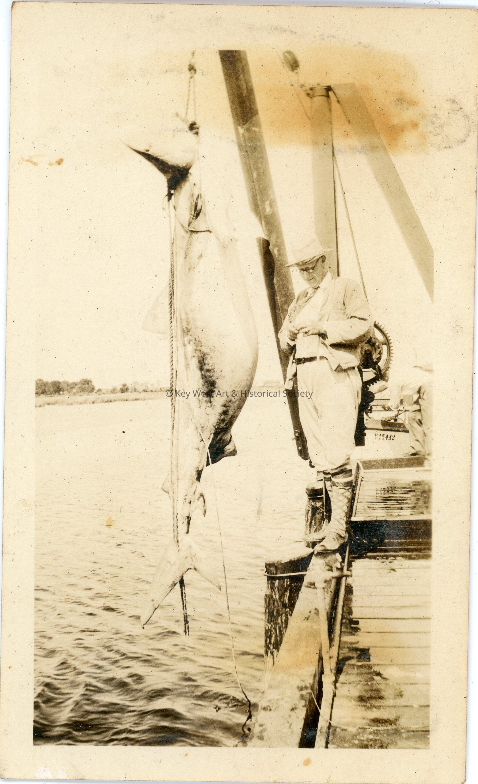 Black and white photograph of a man in a hat and knickerbockers standing on a dock next to a large hanging shark. The photo was part of a photograph album began by Victor H. Baker in 1940.