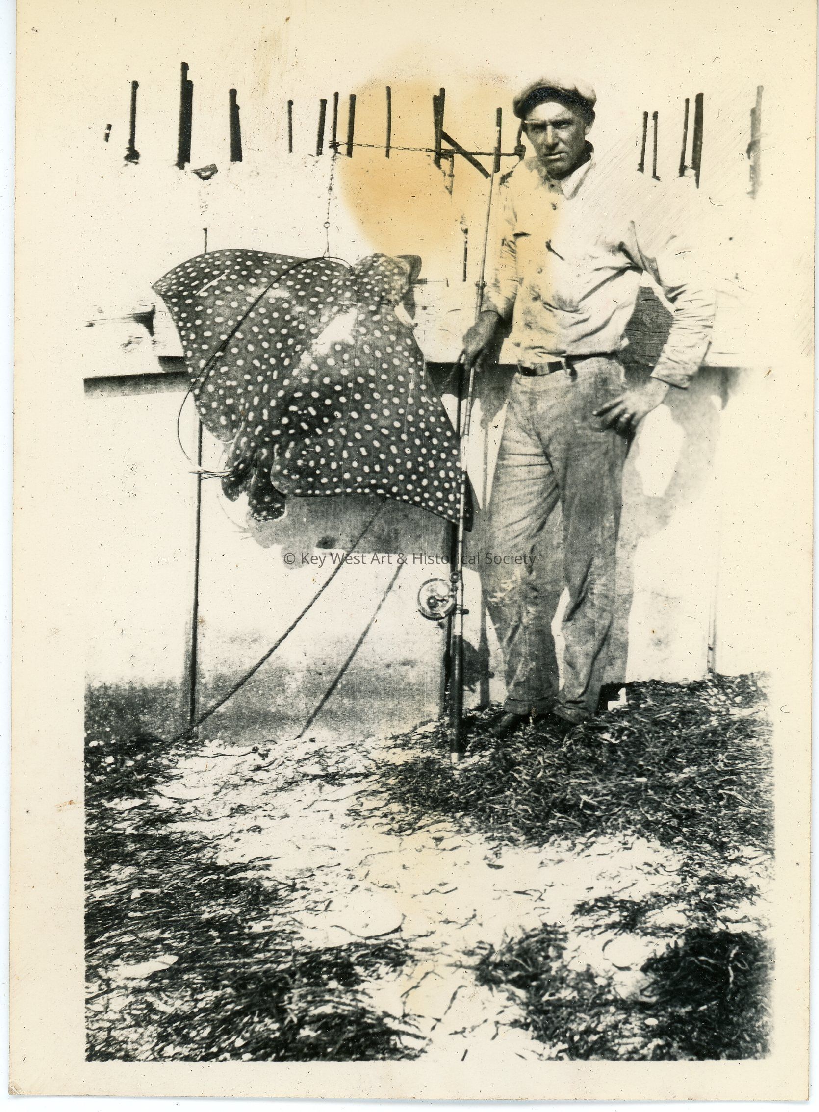 Black and white photograph of a man holding a fishing pole standing next to a spotted eagle stingray. The photo was part of a photograph album began by Victor H. Baker in 1940.