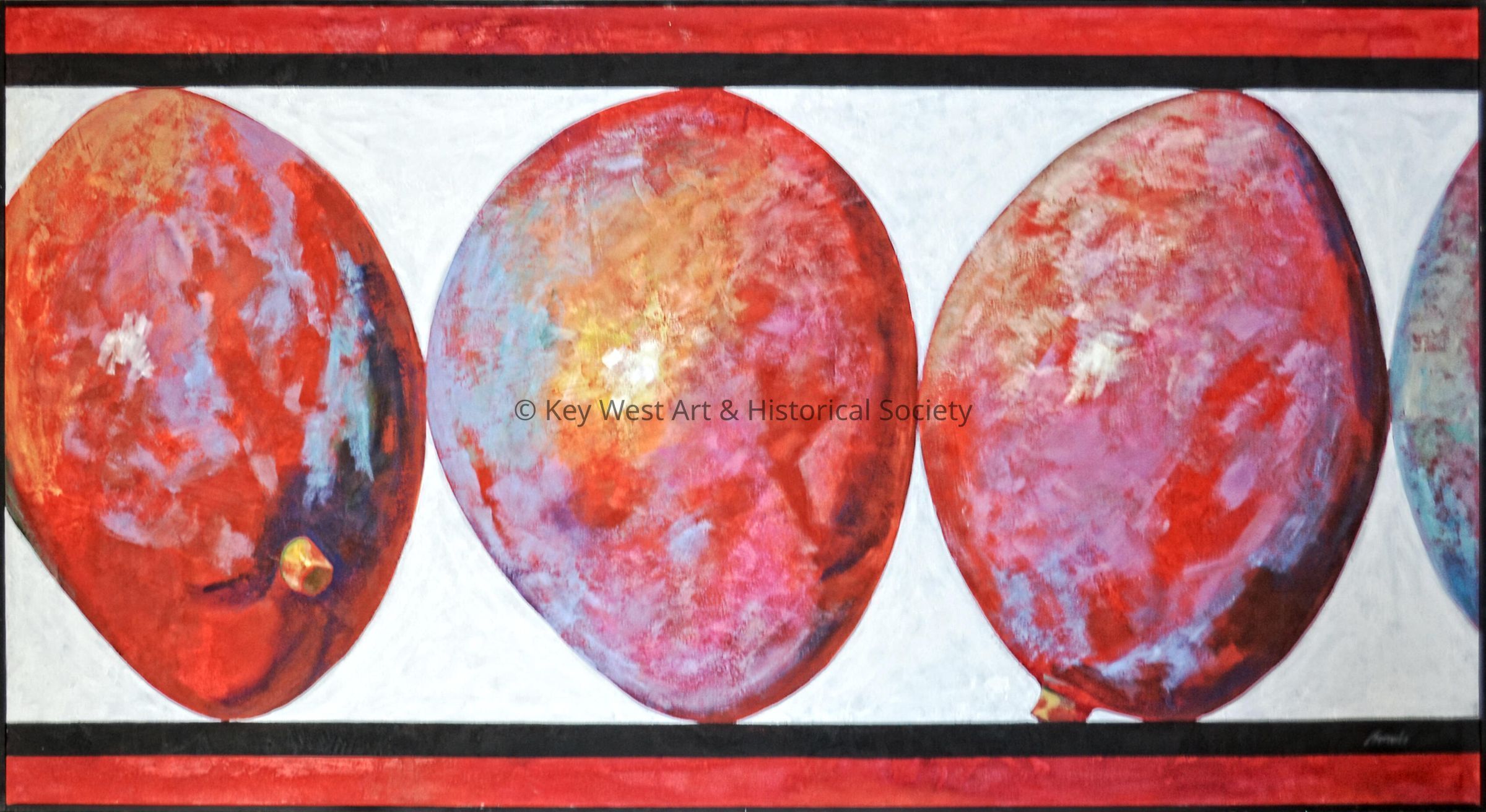 Acrylic painting by Craig Biondi depicting three ripe mangoes in a row set between borders.Type of Painting
