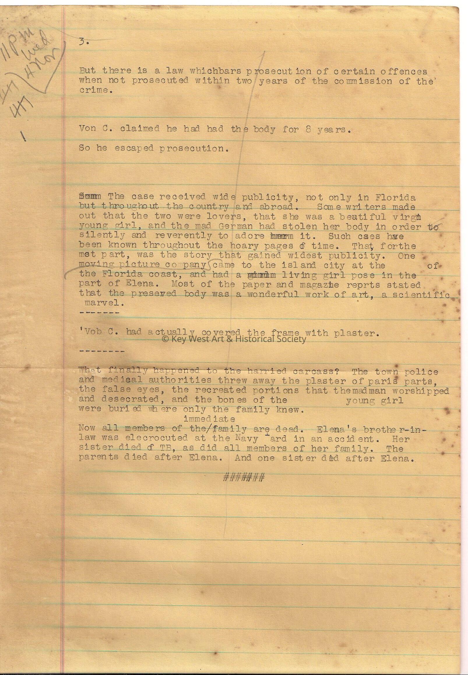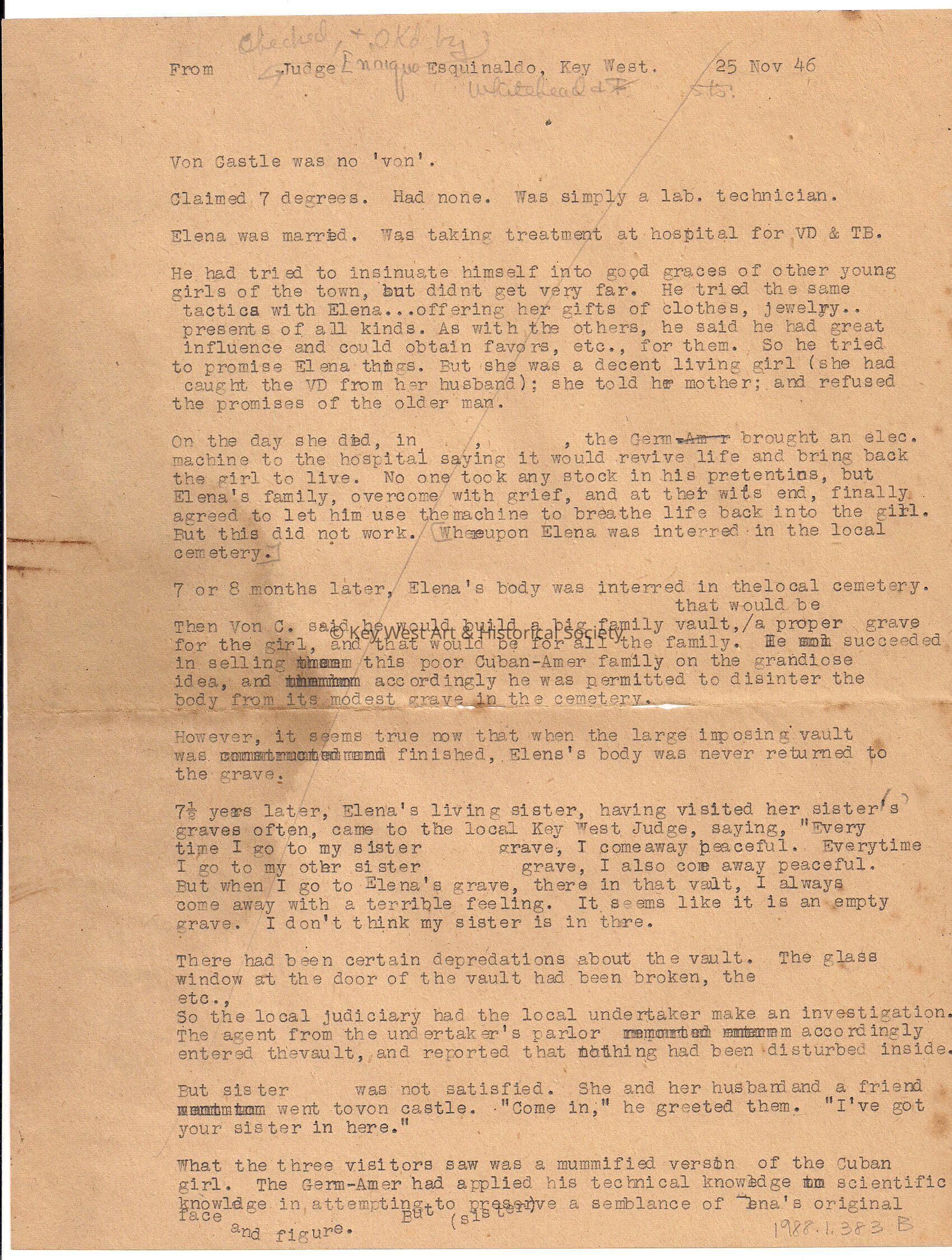 Three typed pages on the story of Carl Tanzler, also known as Count Von Cosel, and Elena de Hoyos. From Judge Enrique Esquinaldo.Collection