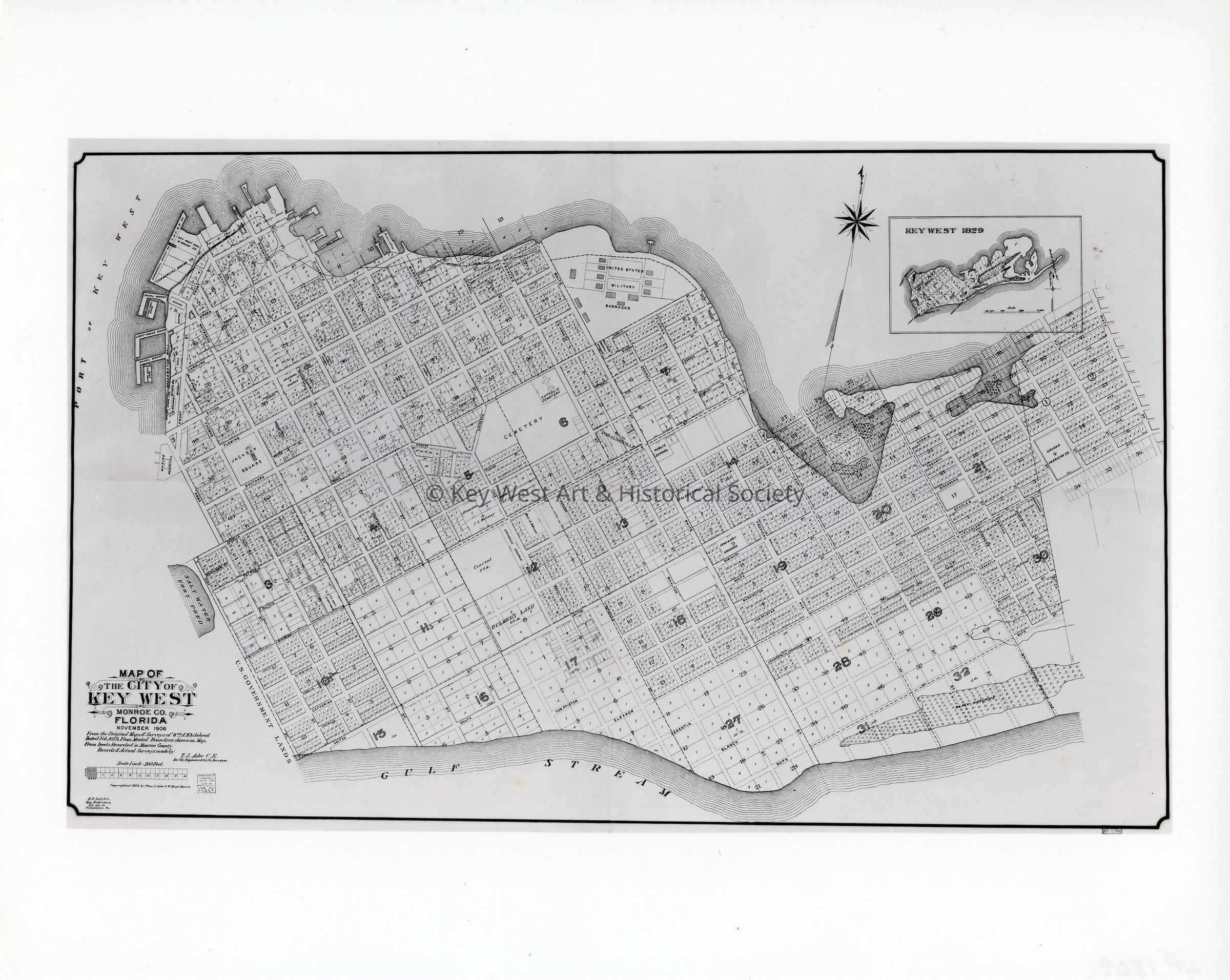 Black and white photograph taken from a map of Key West drawn in November 1906 with a small inset in the upper right corner of the island in 1829.