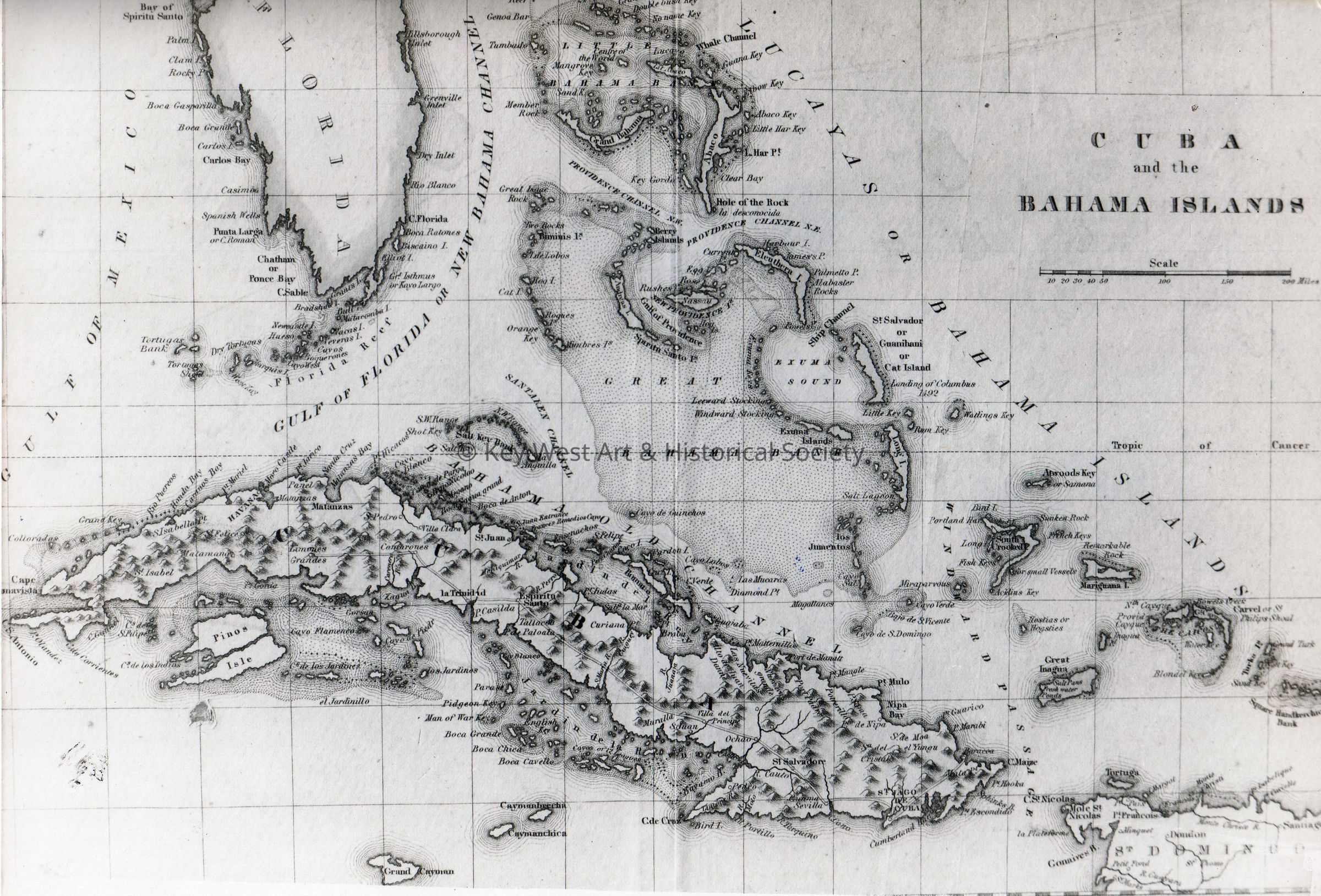 Black and white photograph of a map depicting the south portion of the Florida peninsula, Cuba and The Bahamas.