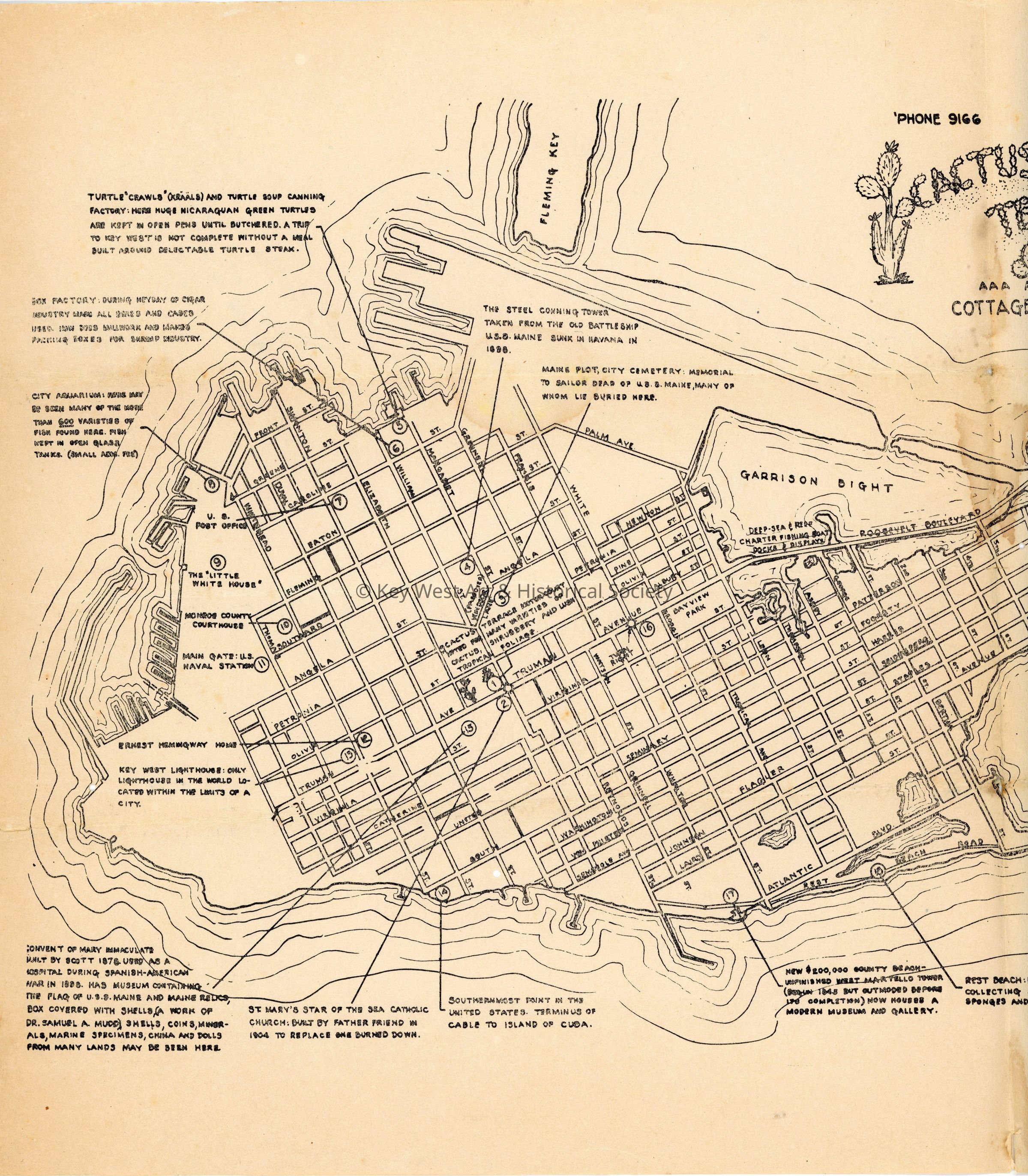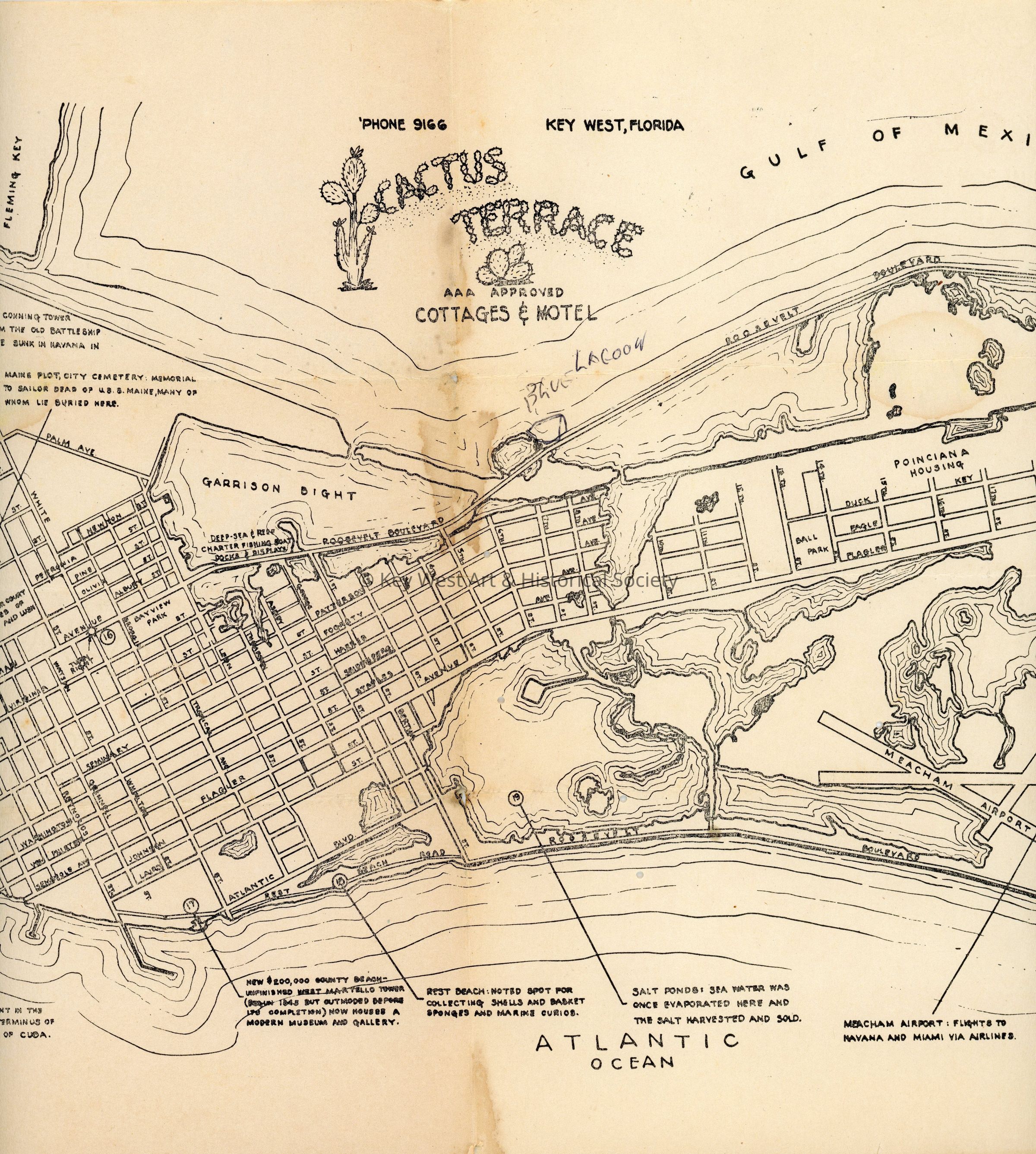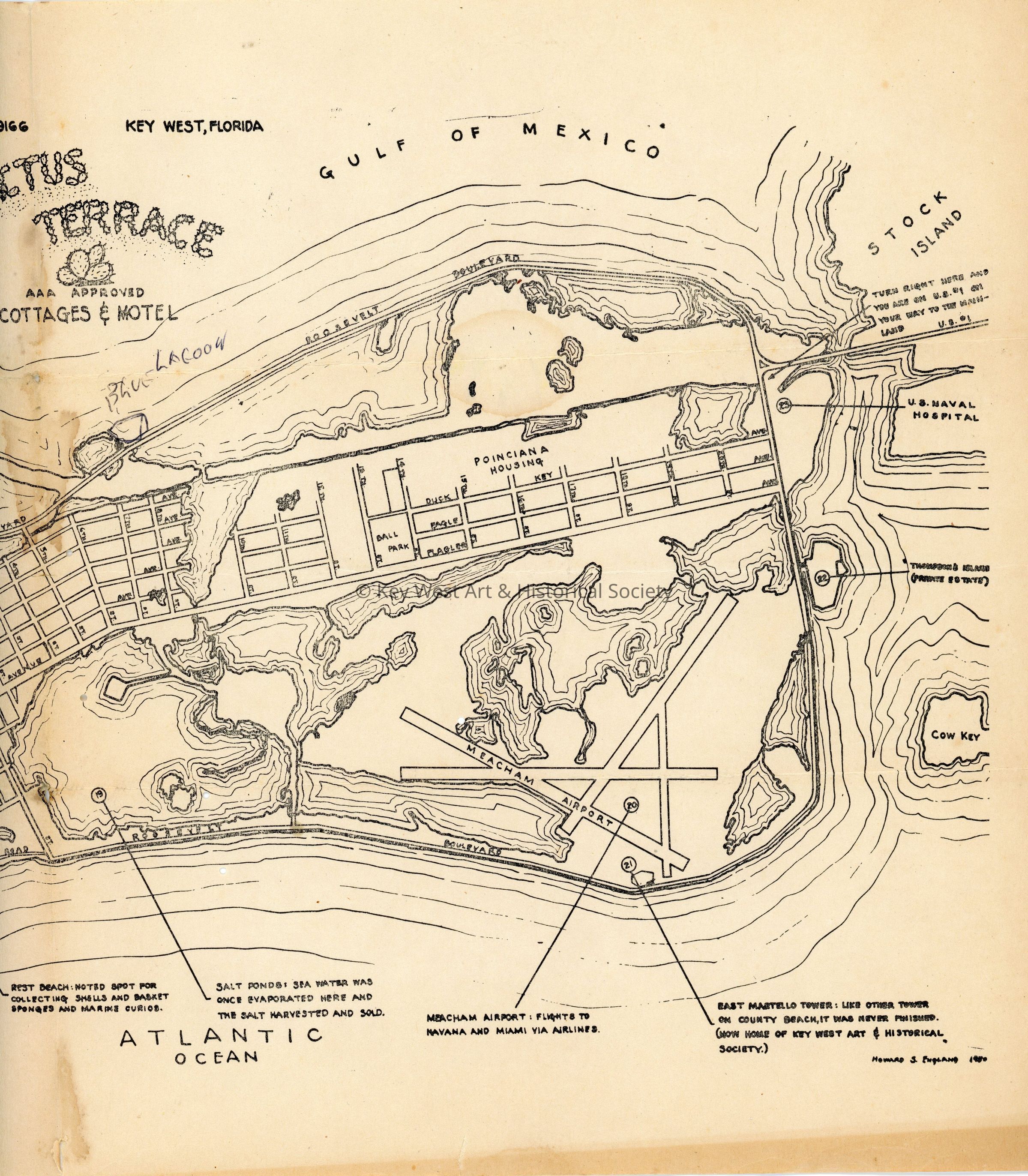 A black and white map of Key West made by Howard S. England in 1980 with an advertisement for Cactus Terrace Cottages & Motel in the upper center. The map provides descriptions of points of interest around the island such as the Southernmost Point, Rest Beach, and East Martello Tower.Collection