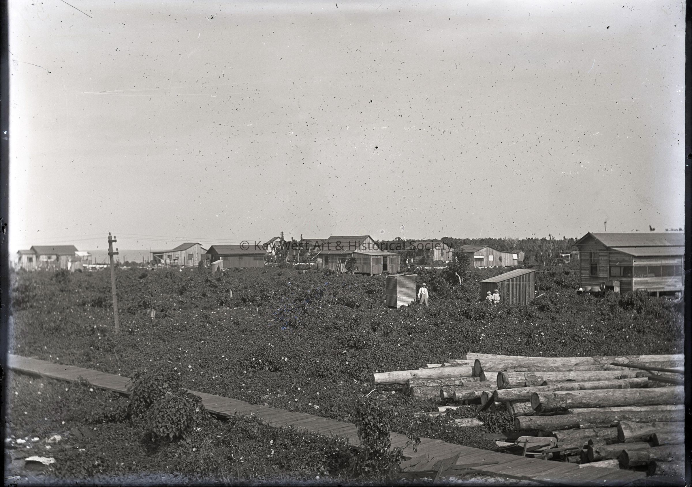 Black and white dry plate glass negative of the Florida East Coast Railway's boardwalk in Marathon that ran from the F.E.C. station to the official quarters. The image was taken during the construction of Seven Mile Bridge on the Overseas Railway.