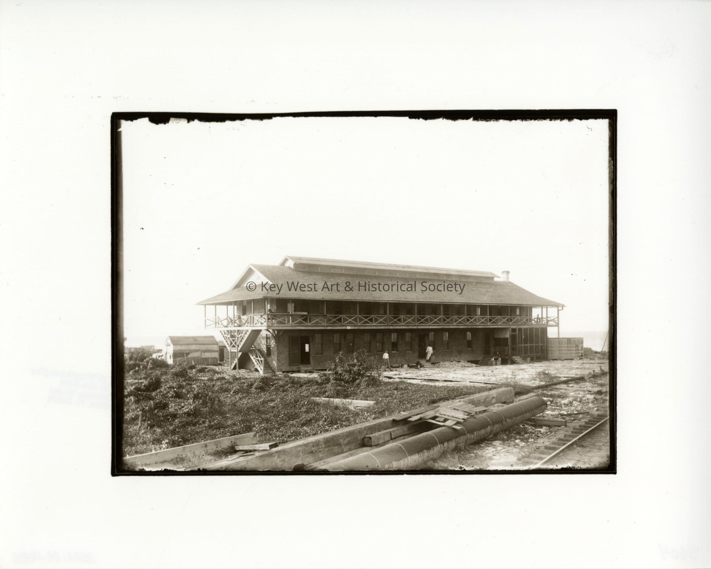 Black and white print taken from a dry plate glass negative of the Marathon Hotel near the Florida East Coast Railway dock. The image was taken during the construction of Seven Mile Bridge on the Overseas Railway.