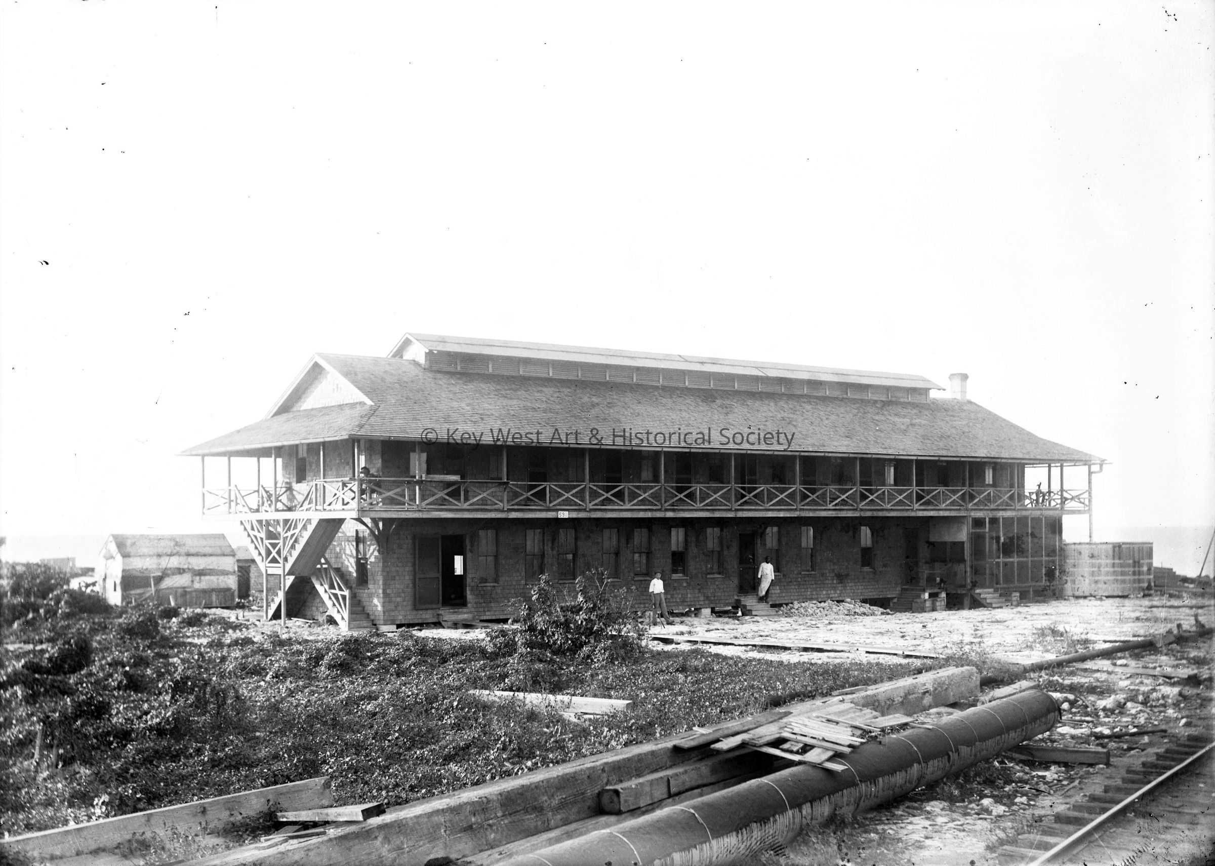 Black and white dry plate glass negative of the Marathon Hotel near the Florida East Coast Railway dock. The image was taken during the construction of Seven Mile Bridge on the Overseas Railway.