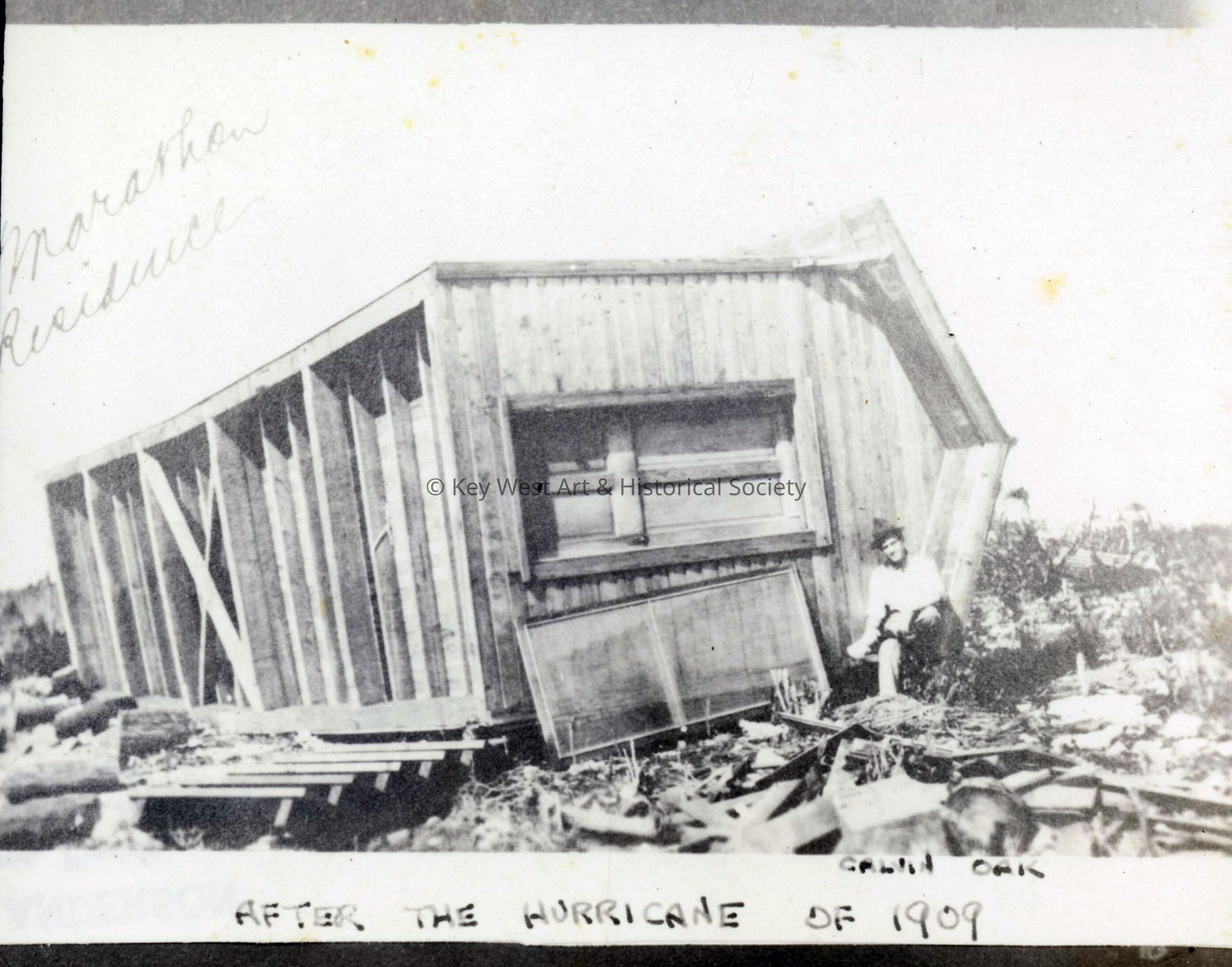 Black and white photograph of an overturned residence on Marathon following the hurricane of 1909. Galvin Oak is alongside the wrecked house.