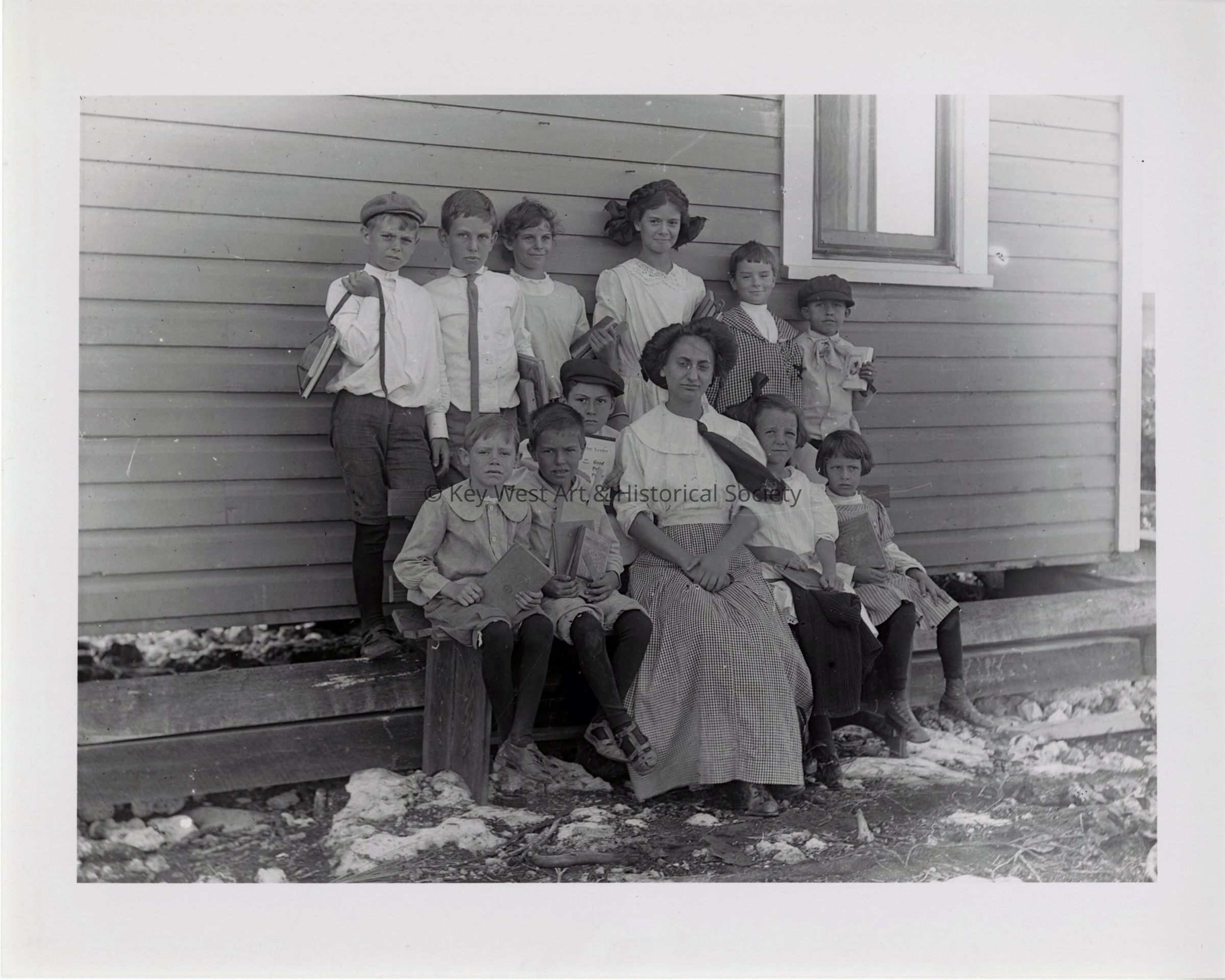 Black and white print taken from a dry plate glass negative of the Marathon School. The students are children of the Overseas Railway construction workers. The image was taken during the construction of Seven Mile Bridge on the Overseas Railway.