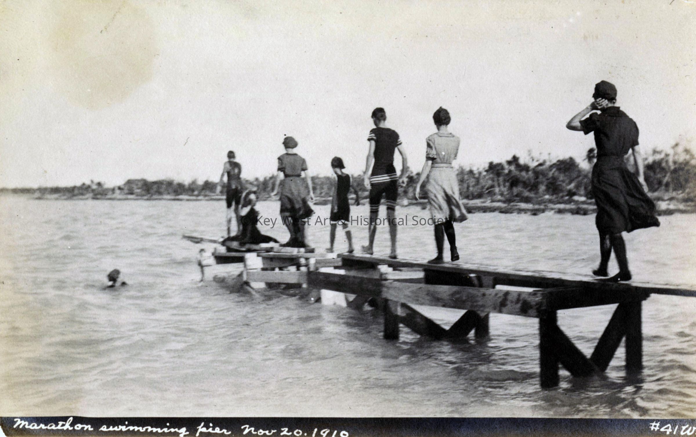 Black and white photograph of a group of unknown bathers walking down the Marathon swimming pier.