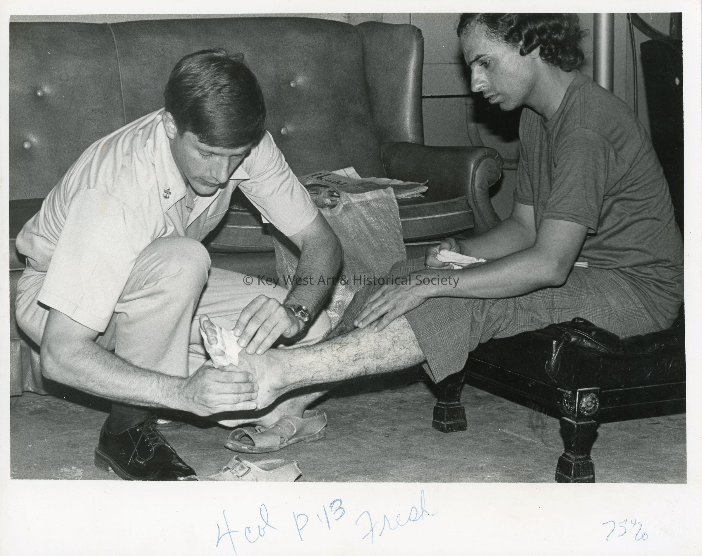 Black and white photograph of US military personnel administering aid to a Cuban refugee during the Mariel Boatlift.