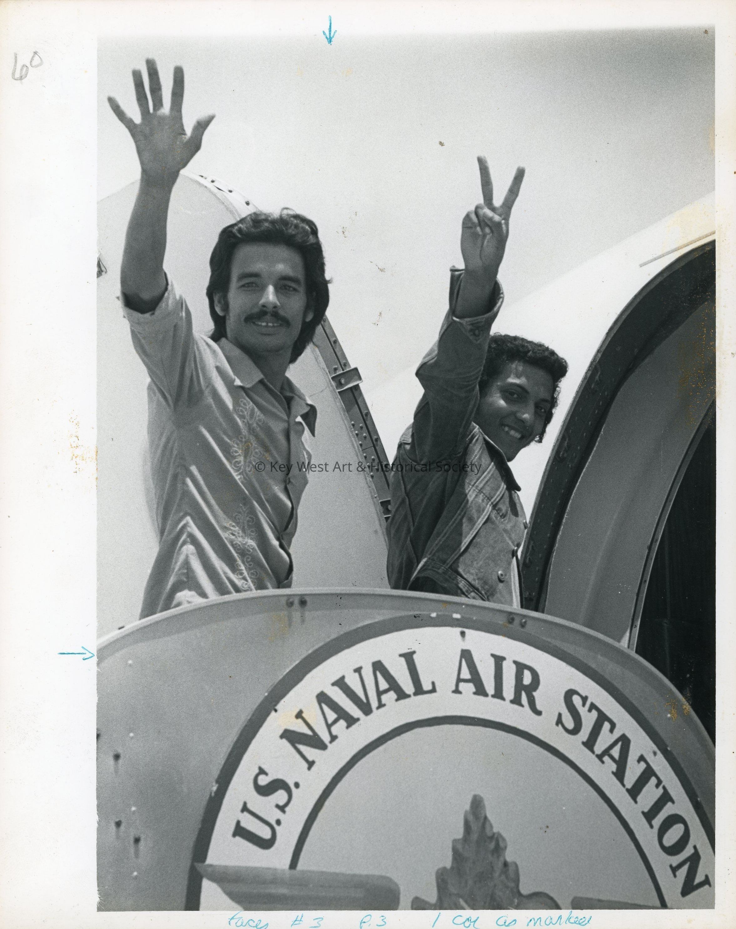 Black and white photograph of two young Cuban refugees boarding an airplane from Naval Air Station Key West after emigrating into the United States during the Mariel Boatlift.