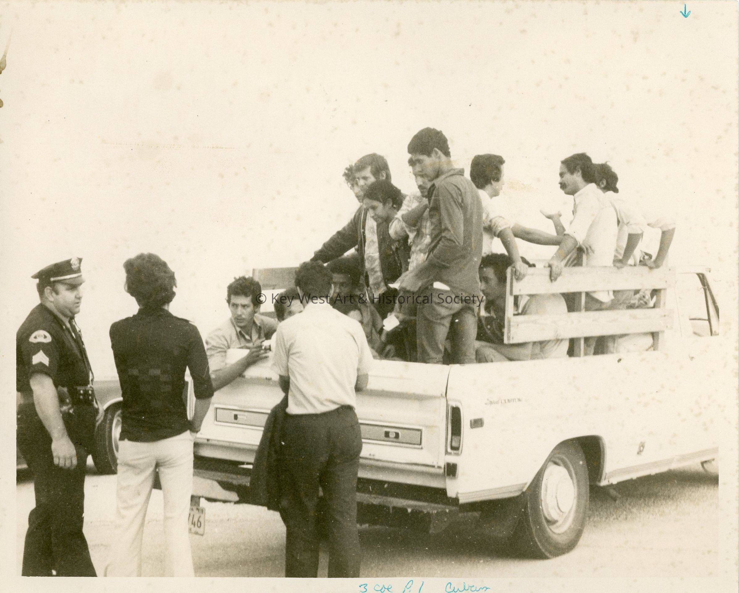 Black and white photograph of Cuban refugees standing in the bed of a pickup truck during the Mariel Boatlift.