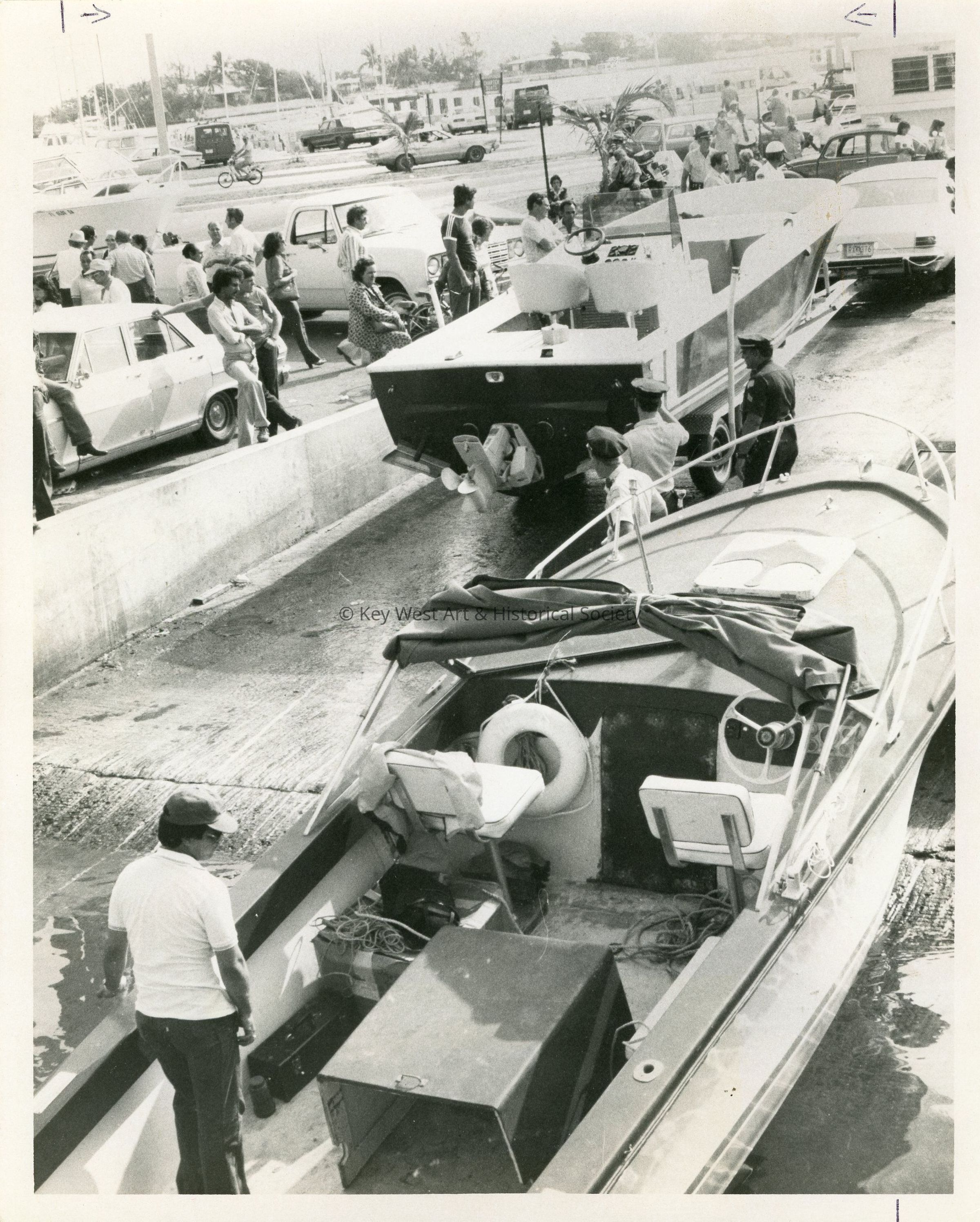 Black and white photograph of boats on a boat ramp during the Mariel Boatlift.