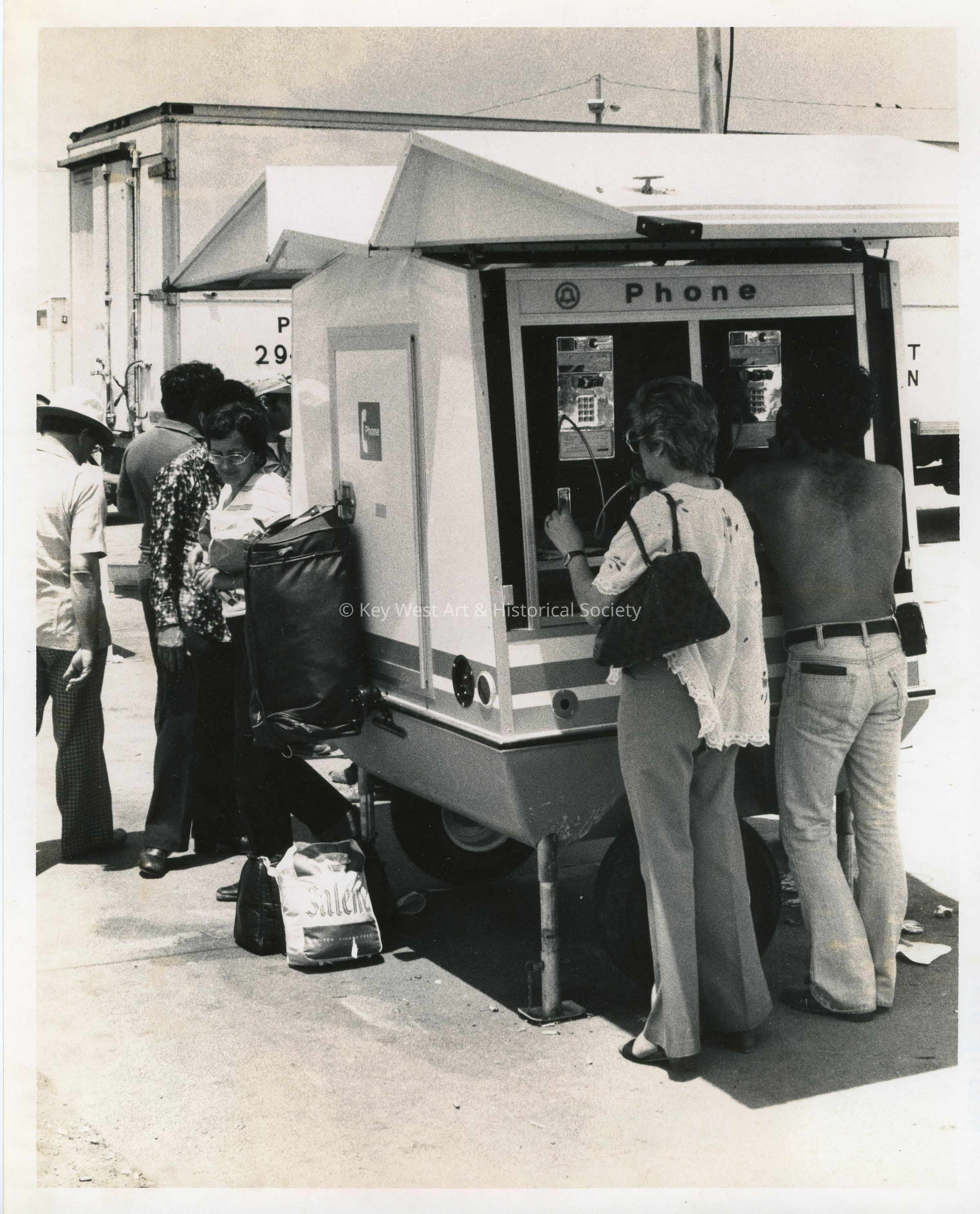 Black and white photograph of Cuban refugees using portable payphone kiosk on the pier of Naval Station Key West during the Mariel Boatlift.