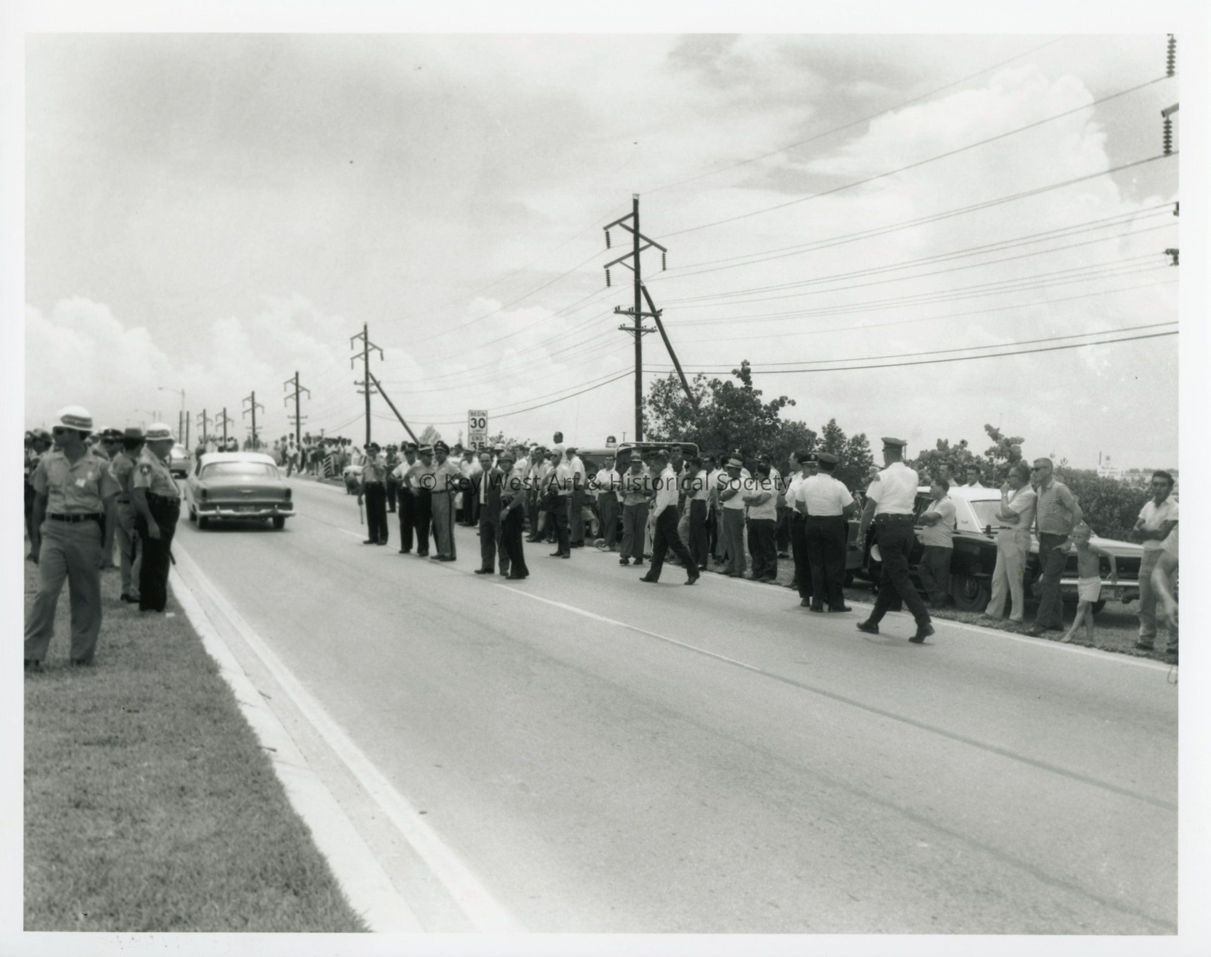 Black and white photograph of a law enforcement on the highway during the Mariel Boatlift.