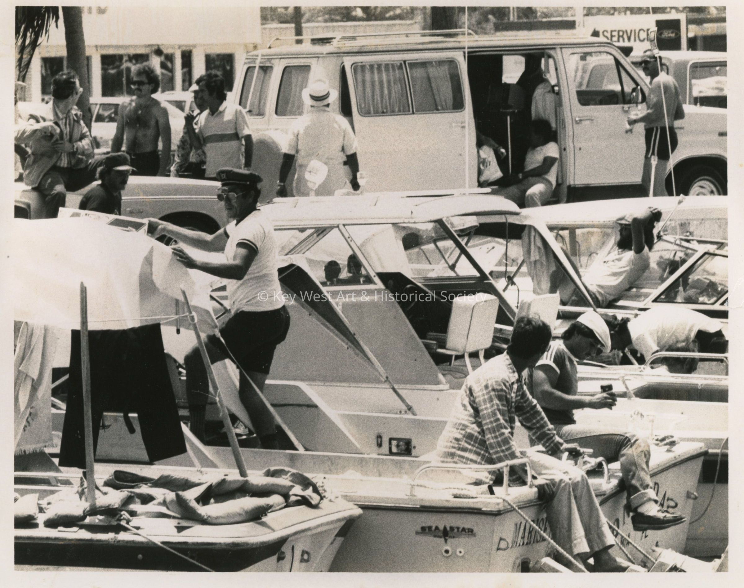 Black and white photograph of boats rafted to one another at the docks during the Mariel boatlift.