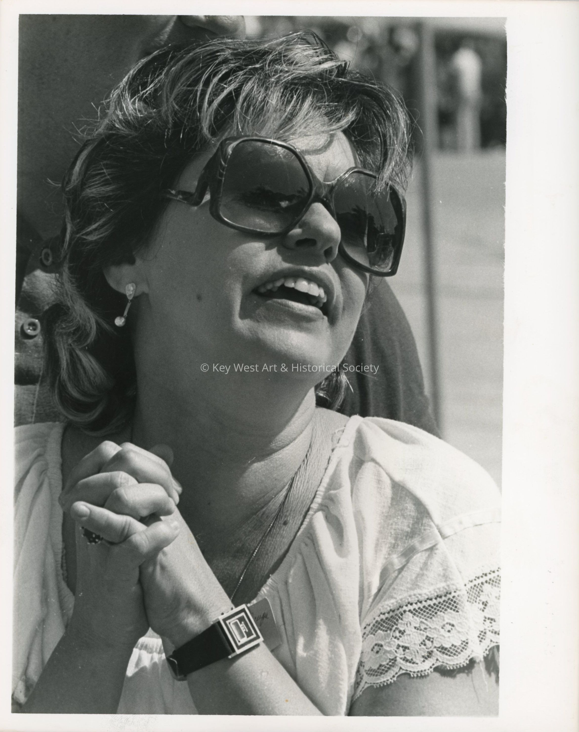 Black and white photograph of a Cuban woman happy to be safely in the United States.