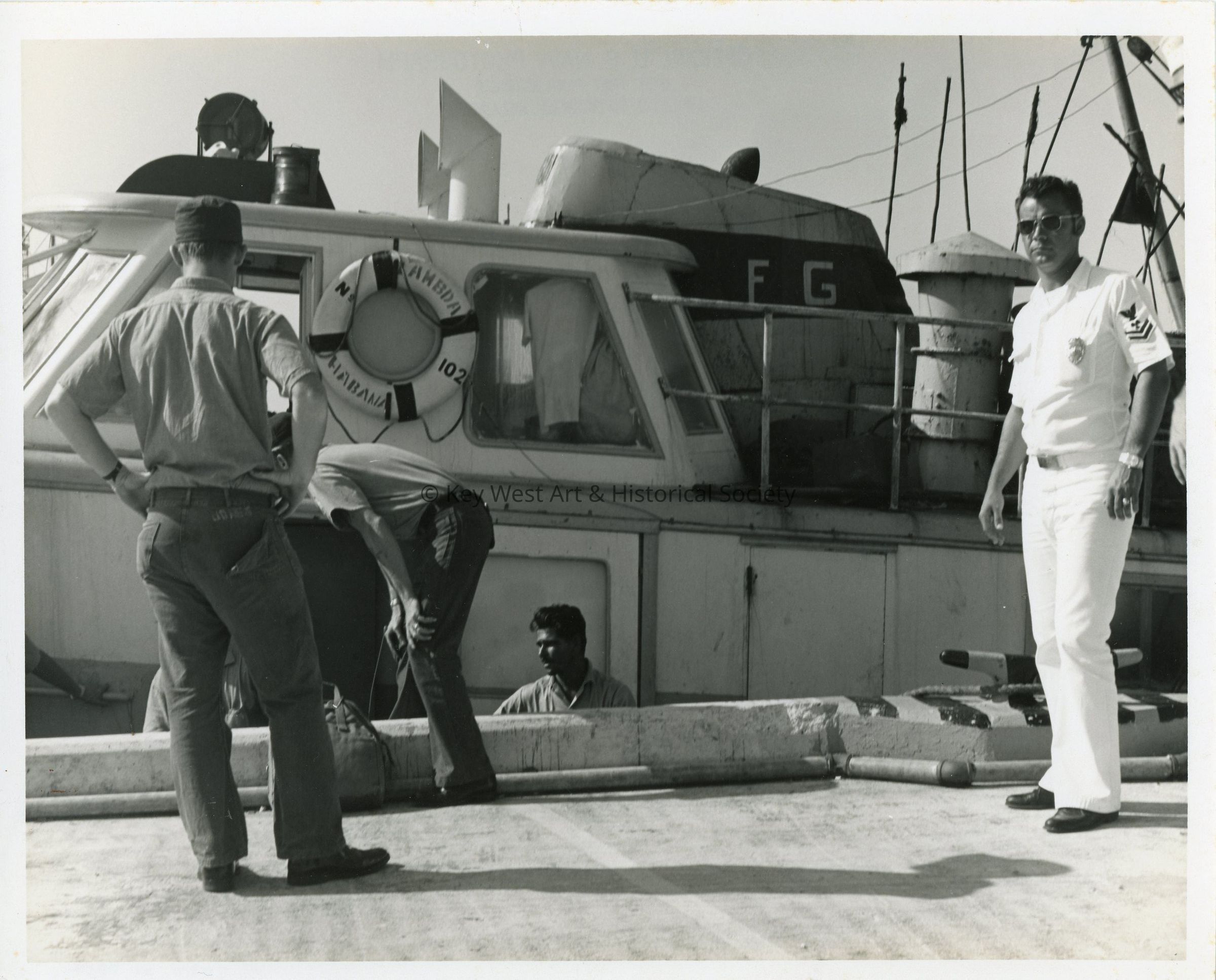 Black and white photograph of a Cuban vessel docked at Naval Station Key West during the Mariel Boatlift.