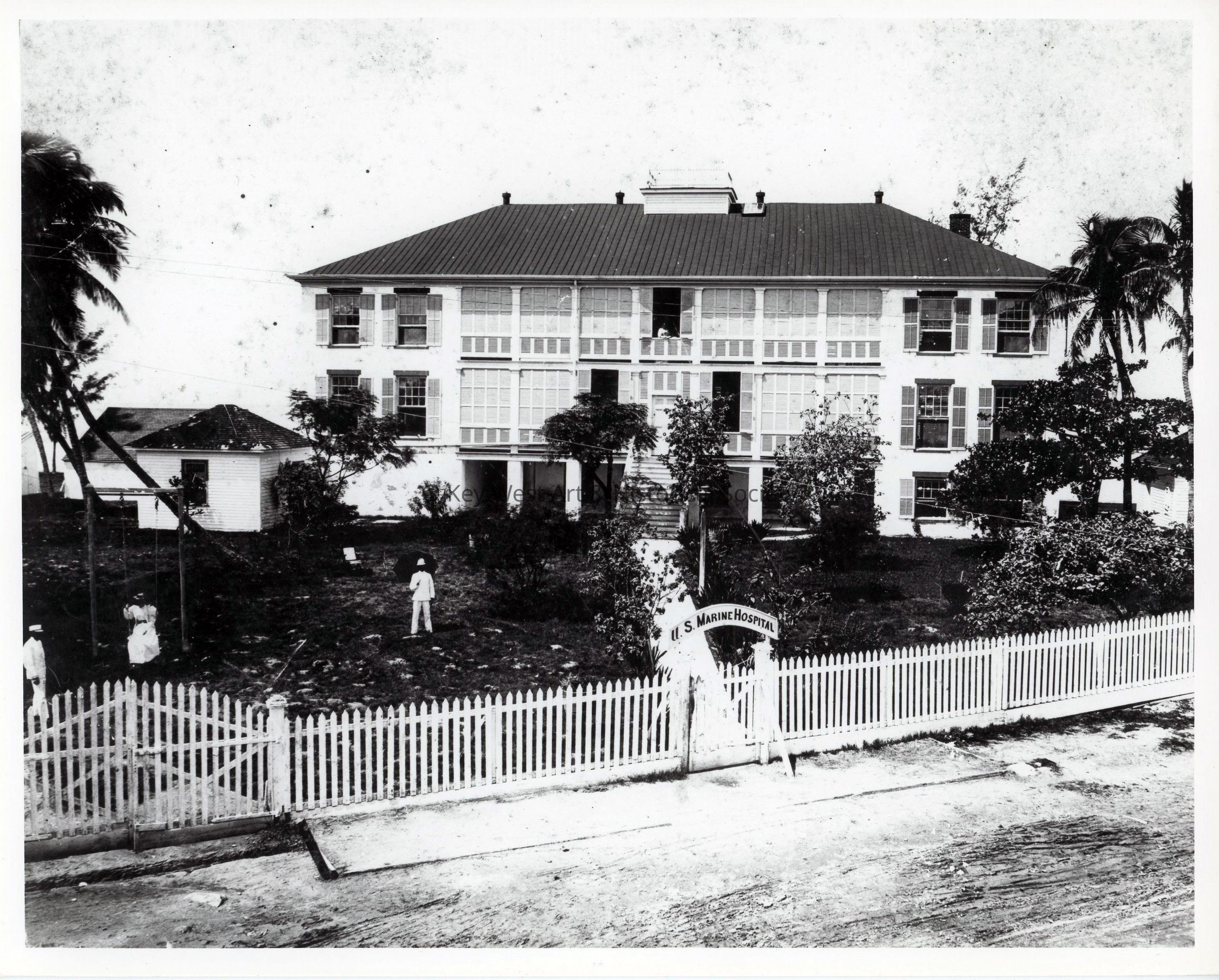 Black and white photograph of the Key West Marine Hospital. The first hospital in Key West was opened for ill and injured seamen. Townspeople had pleaded to the federal government for funds for the facility. Seamen were taxed to provide the funds. The hospital was built on Fleming and Emma streets in 1844.